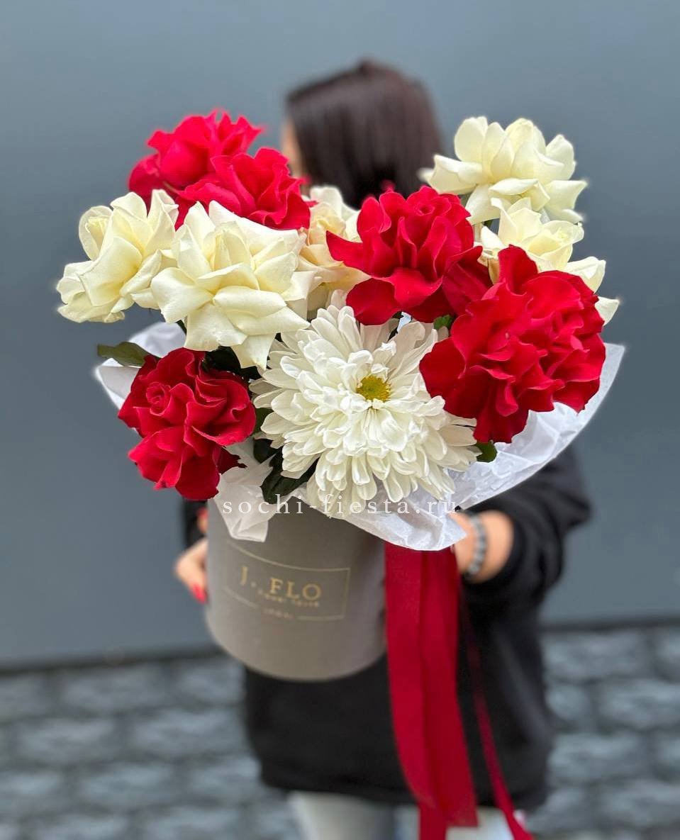 15 роз сорта джумилия, лента, дизайнерская упаковка.