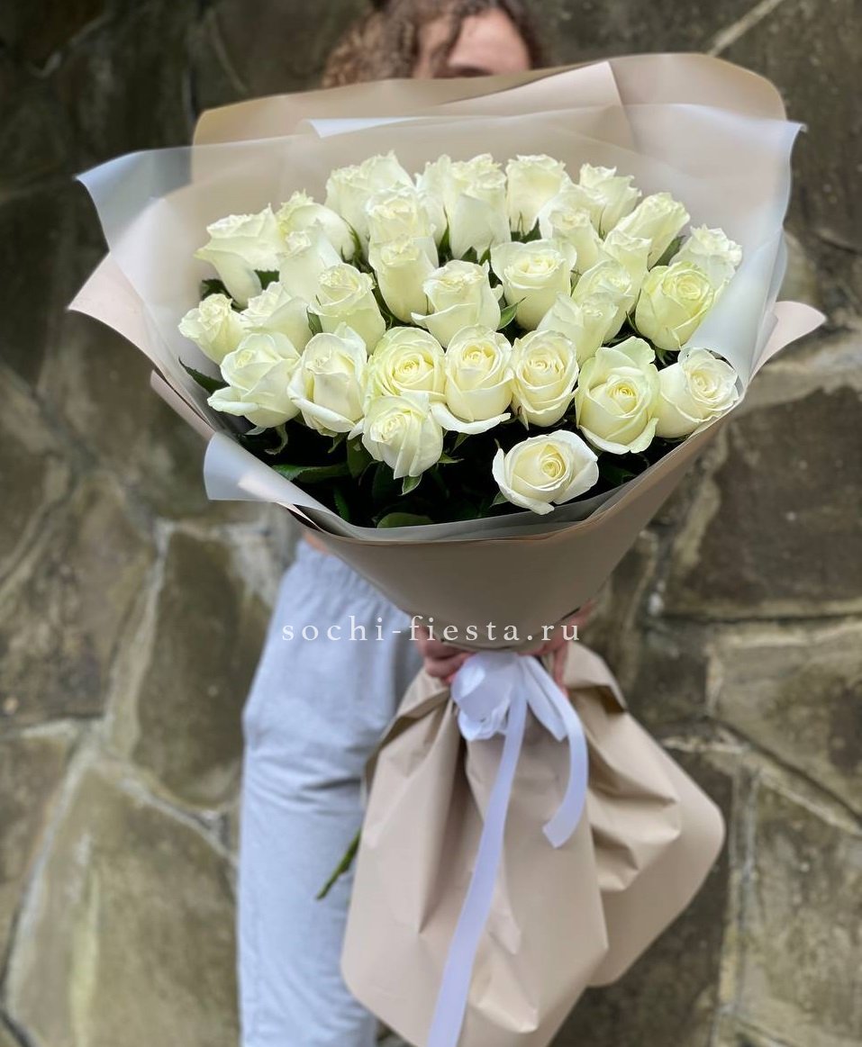 Тридцать пять белых роз образуют объемную композицию с выразительным силуэтом. Светлая упаковка поддерживает воздушность и графичность линий.