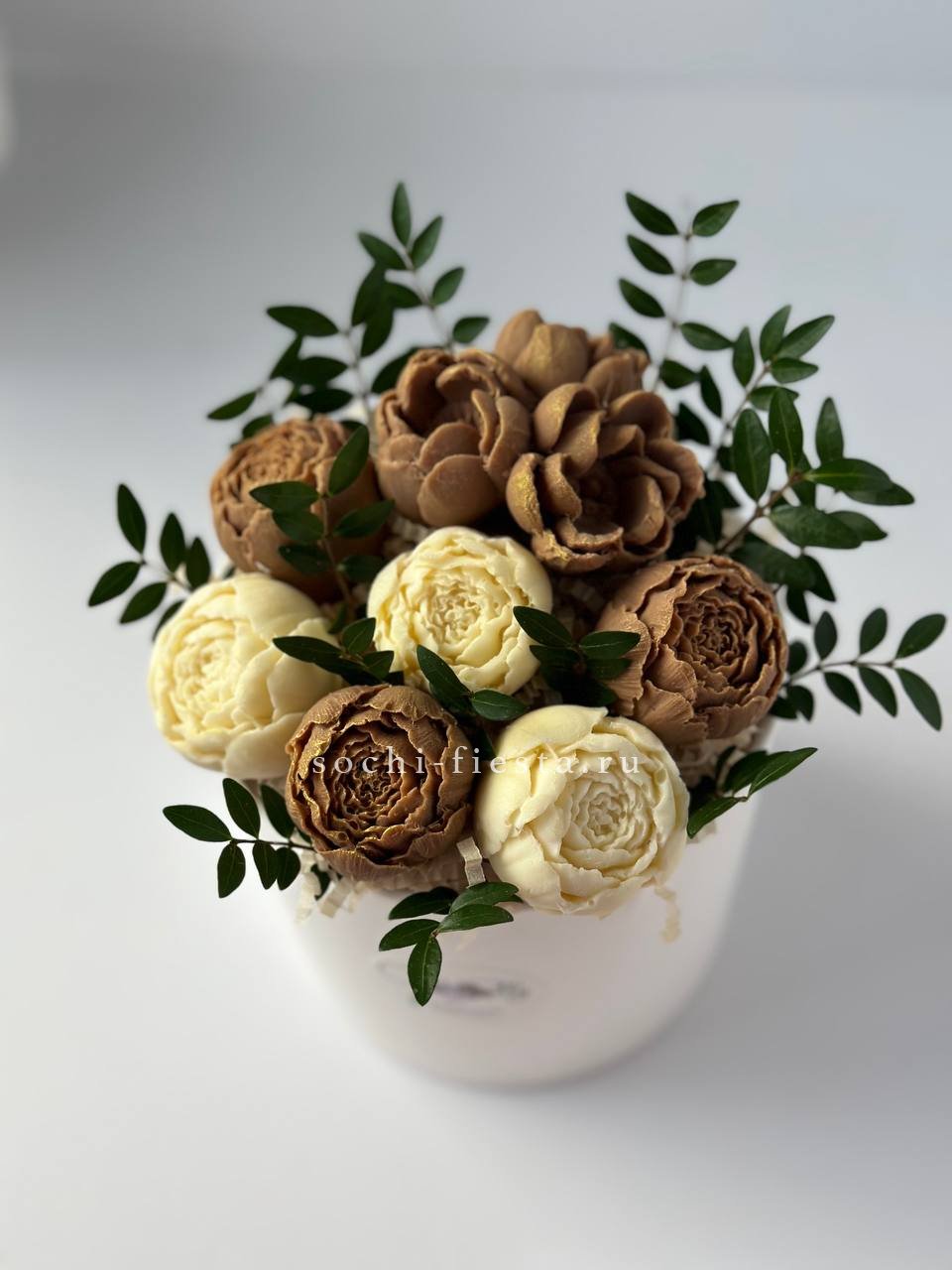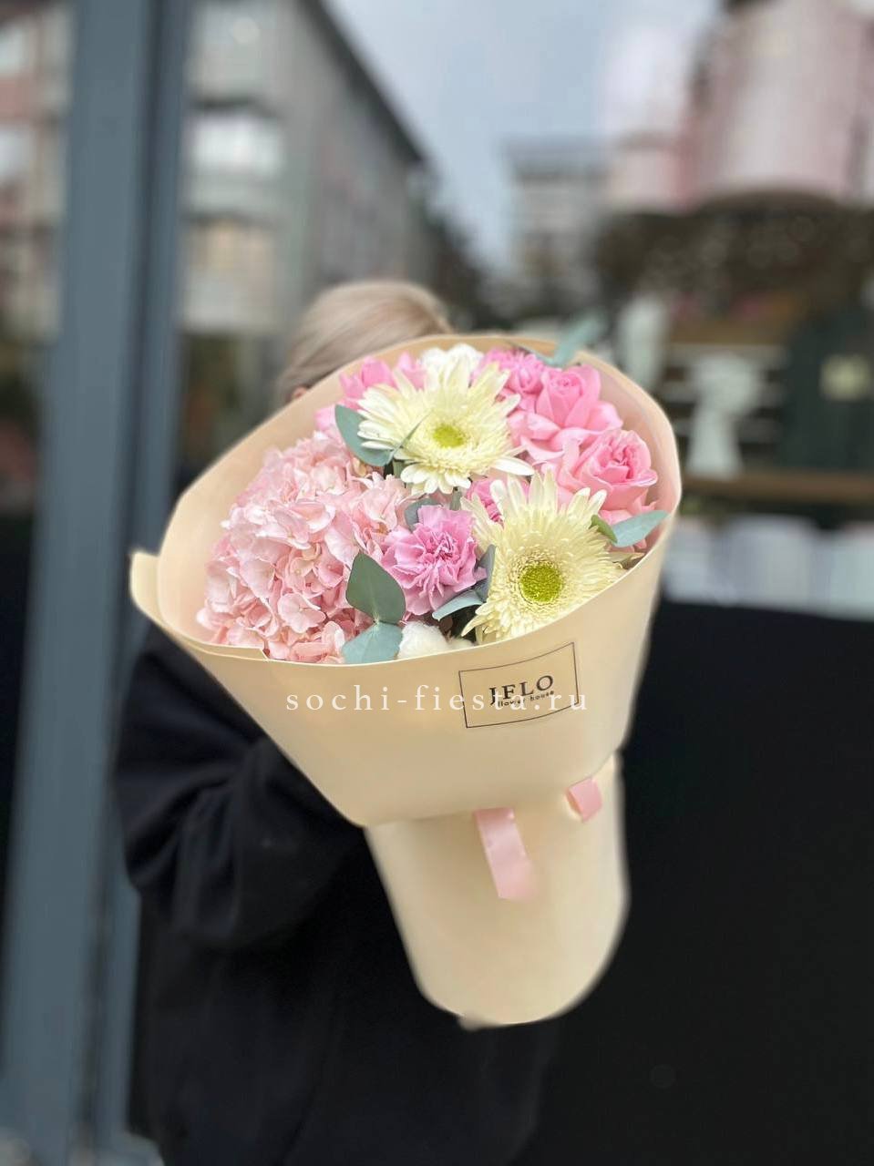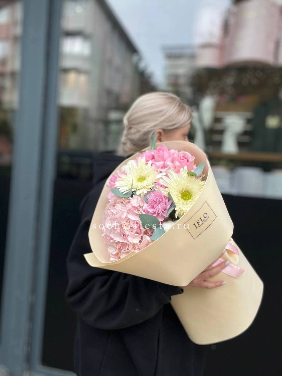гортензия, хлопок, бомбастик, белая роза, маттиола- может меняться от сезона на диантус, ковыль, упаковка.