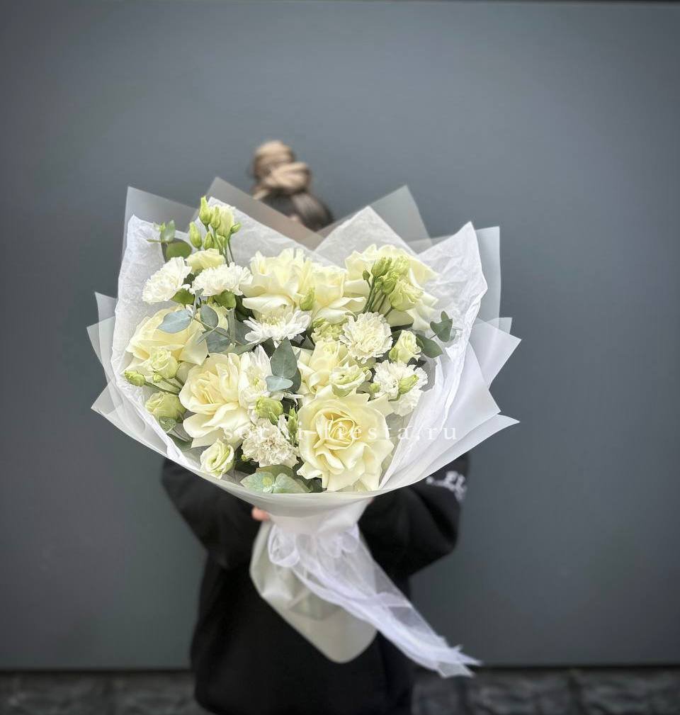 белые розы, диантус, хризантема кустовая, эустома, эвкалипт, лента, авторское оформление.