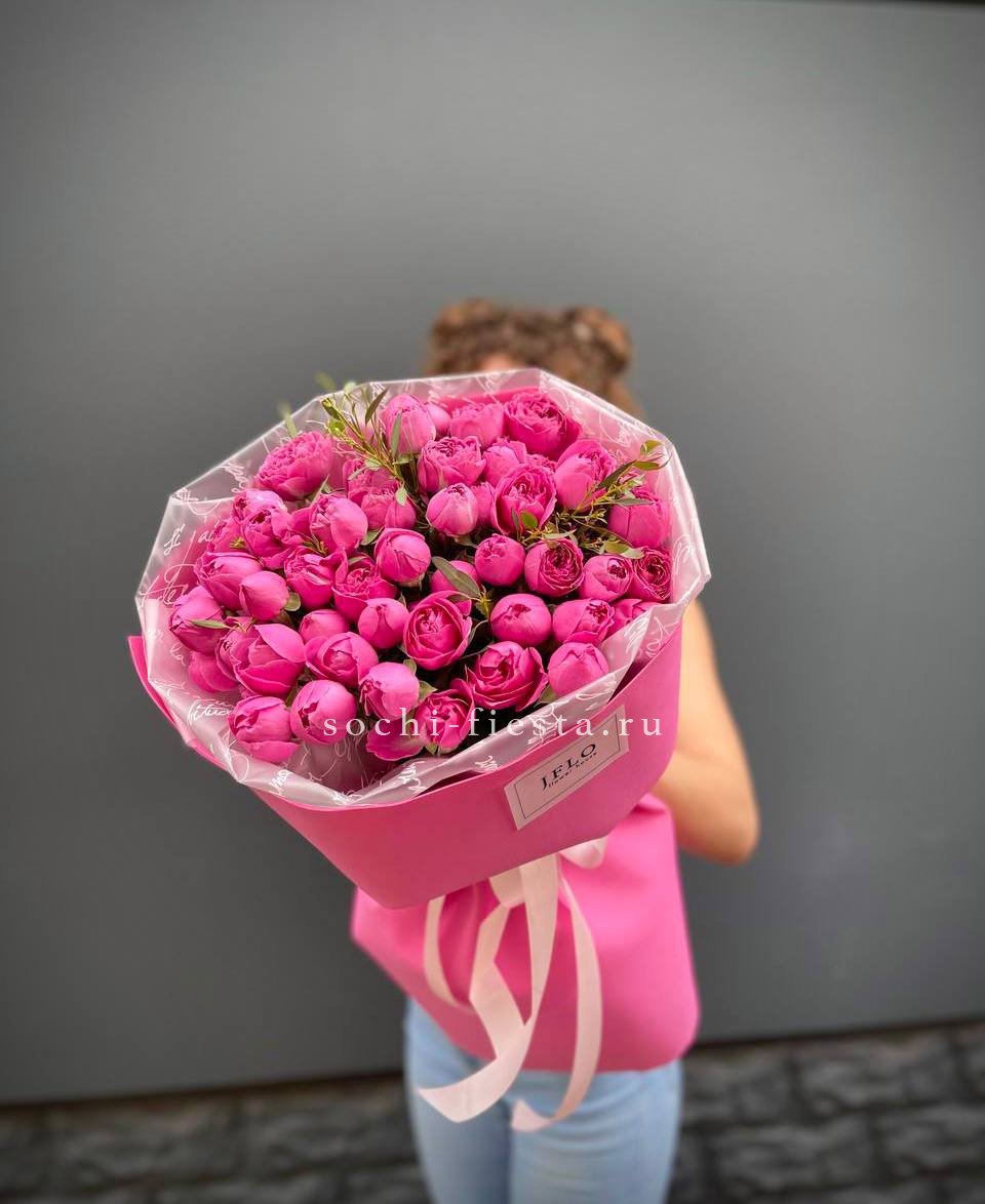 пионовидные розы, розовые розы, эвкалипт, лента, дизайнерская упаковка.