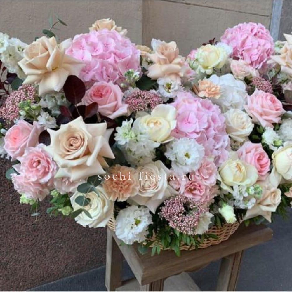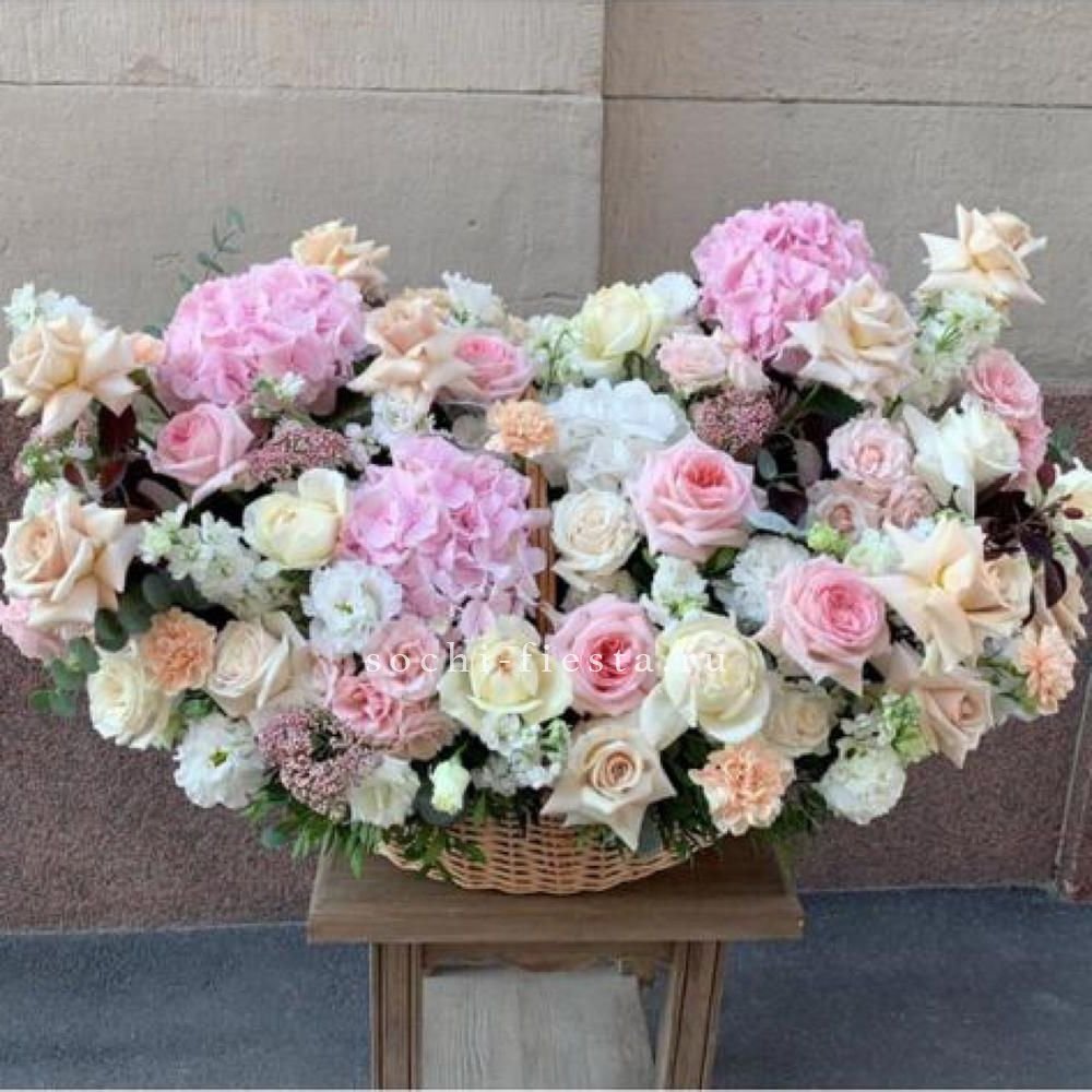 роза белого и розового оттенка 555 шт., оформление в каркас или корзину.