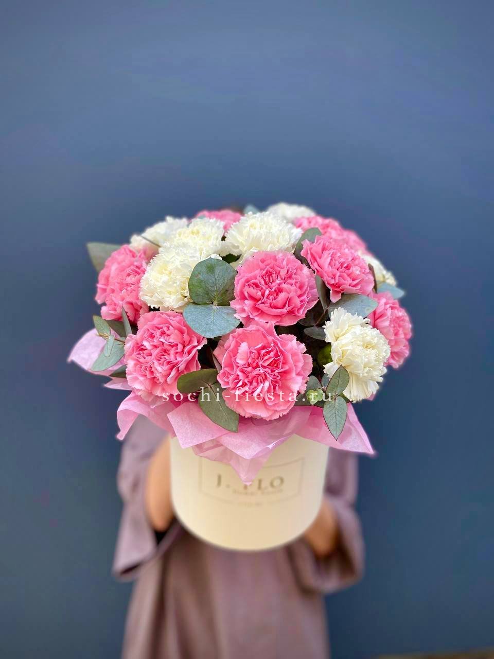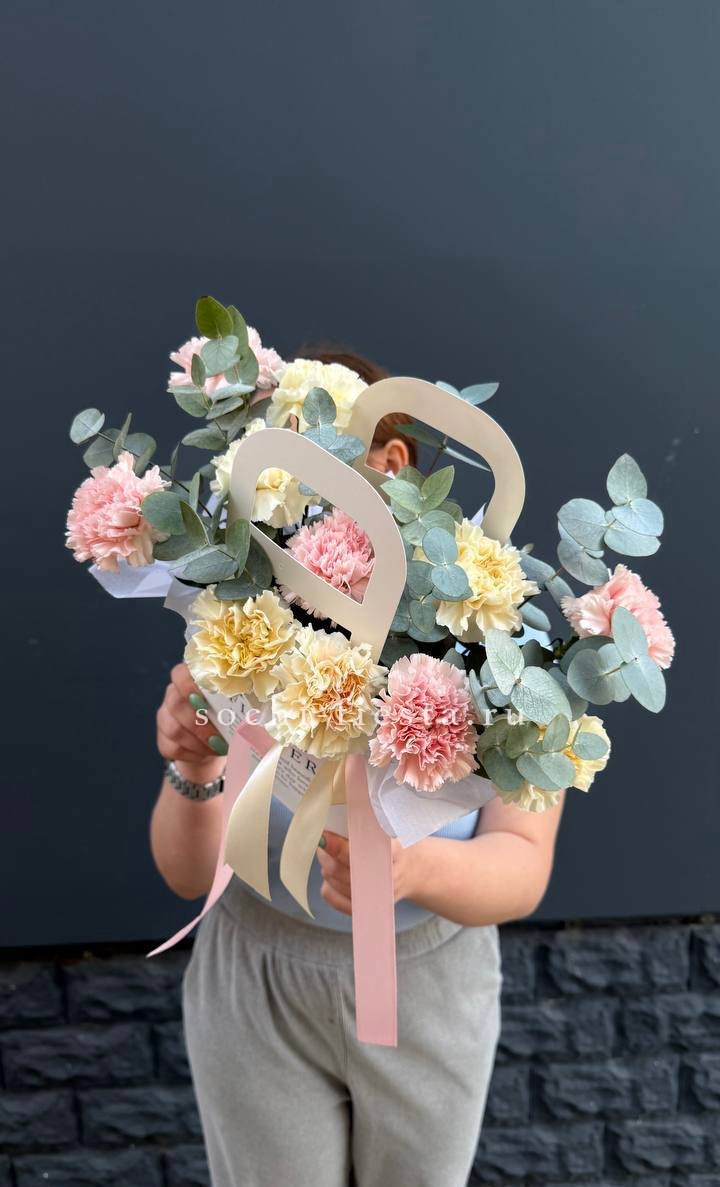 Двадцать один стебель диантуса собраны в плотную форму, где каждый бутон создает свою волну цвета и фактуры. Крафтовая упаковка держит композицию собранной и графичной.