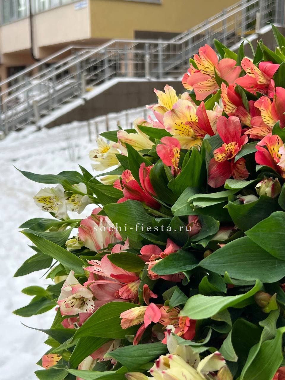 Пятьдесят одна ветка альстромерий — это масштабная композиция с выраженным визуальным присутствием. Букет заполняет пространство и привлекает внимание своим объёмом.