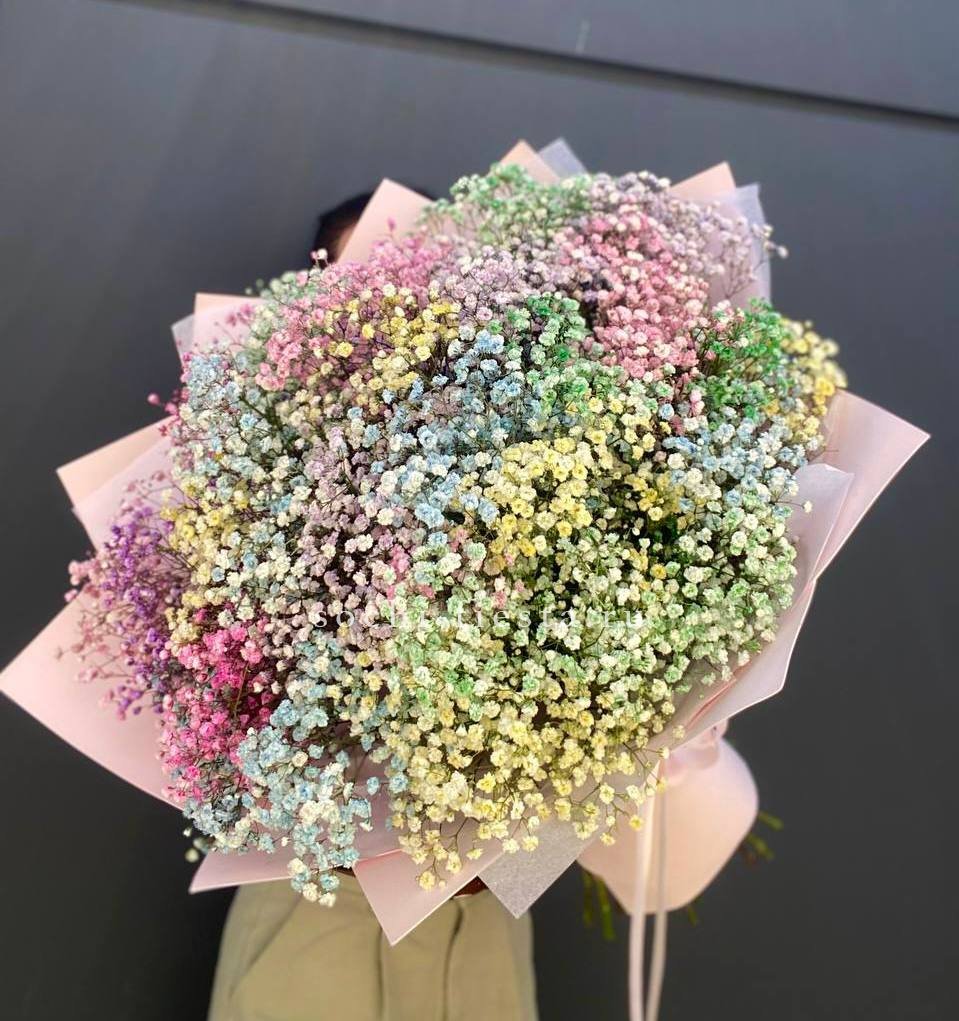 Воздушное облако из мелких соцветий создает объёмную текстуру и мягкий силуэт. Двадцать пять веток гипсофилы собраны в пышную композицию, которая наполняет пространство лёгкостью и свежестью.
