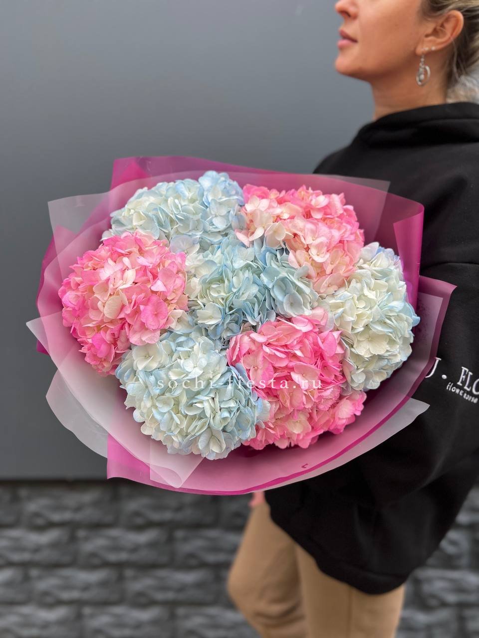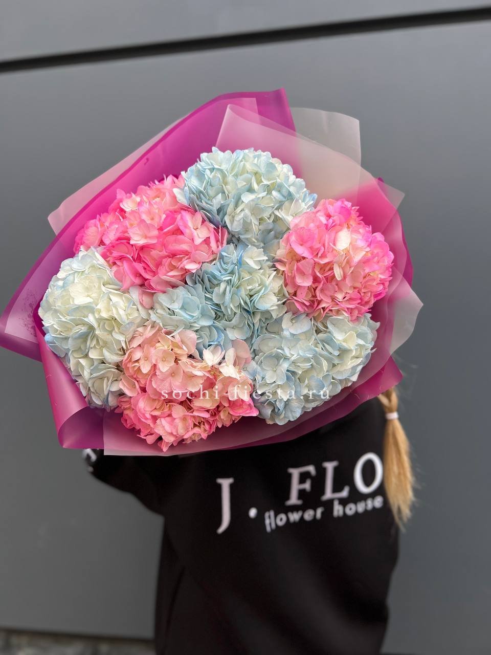 гортензия, лента, зелень по наличию, дизайнерская упаковка.