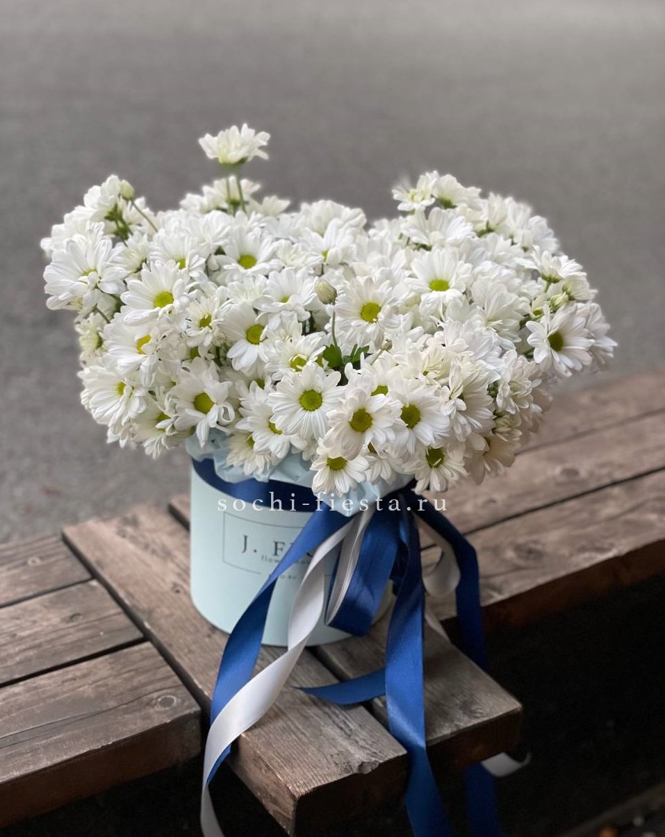 хризантемы 7 штук, оформление беж с тремя бантиками тонкими с сердечками.