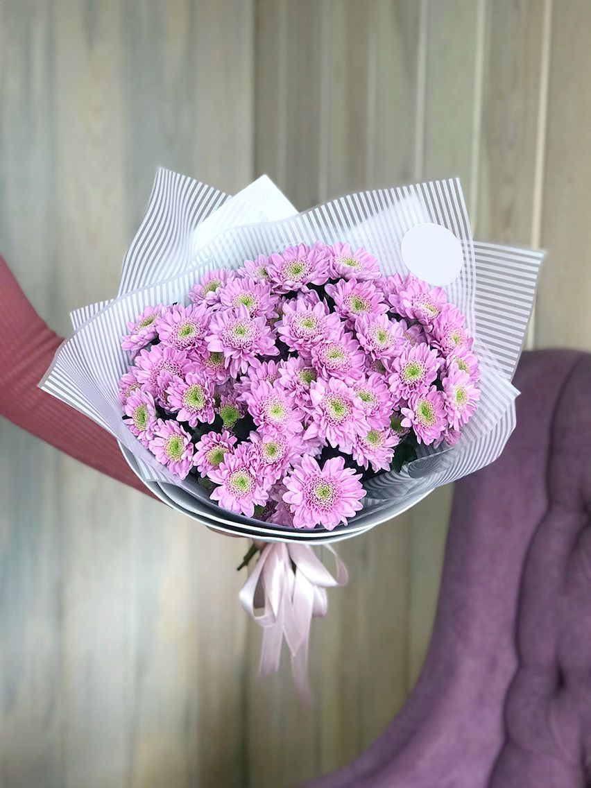 Девять веток кустовой хризантемы образуют пышную шапку соцветий в розовой гамме. Каждая ветка раскрывается множеством бутонов, создавая объёмную текстуру и живую игру оттенков. Упаковка завершает композицию, сохраняя её естественную воздушность.