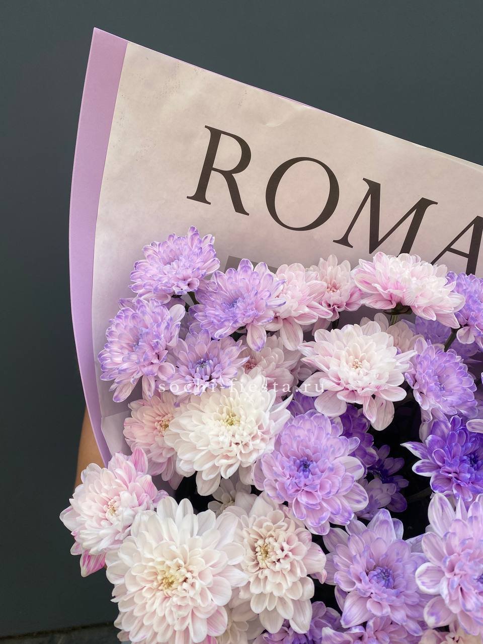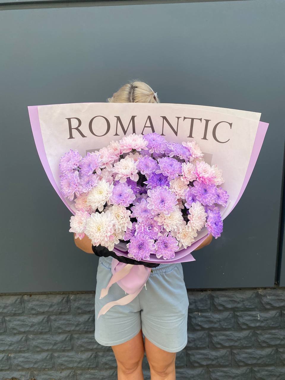 Сиреневая гамма с переходом в розовый создаёт мягкую дымку соцветий. Кустовые хризантемы собраны в плотную шапку, где каждая ветка раскрывается своим ритмом. Монохромная композиция для тех, кто ценит спокойную красоту.