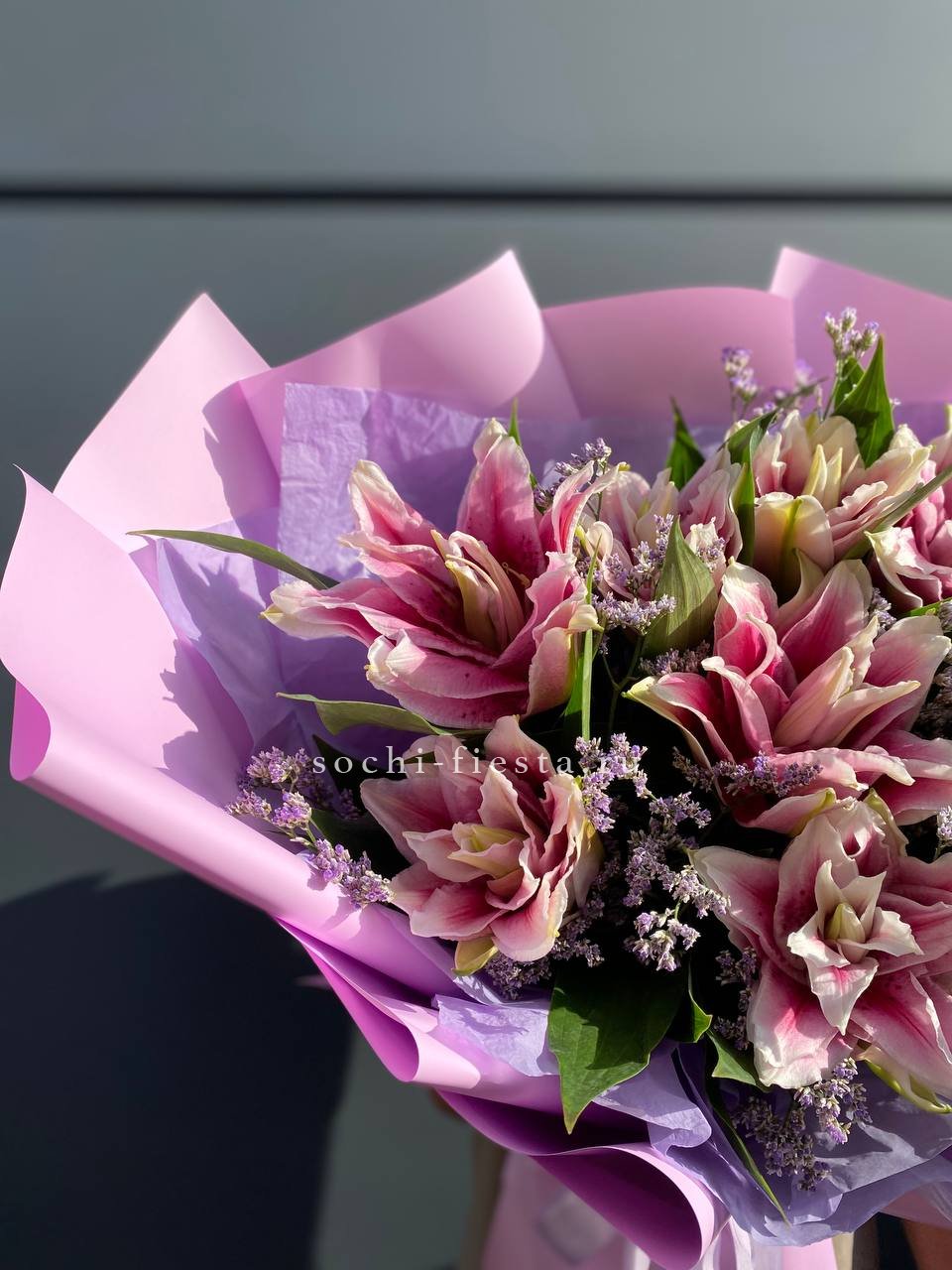 9 пионовидных лилий, лимониум, лента, авторская упаковка.