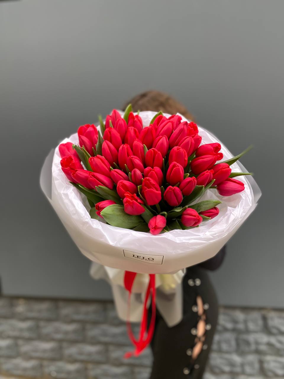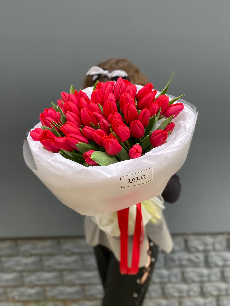 Пятнадцать бутонов собраны в плотную группу и упакованы в прозрачную пленку. Красный оттенок лепестков создает яркое цветовое пятно, которое сразу привлекает внимание. Тюльпаны сохраняют свежесть долго и не требуют сложного ухода.