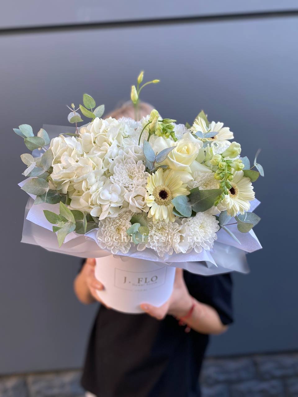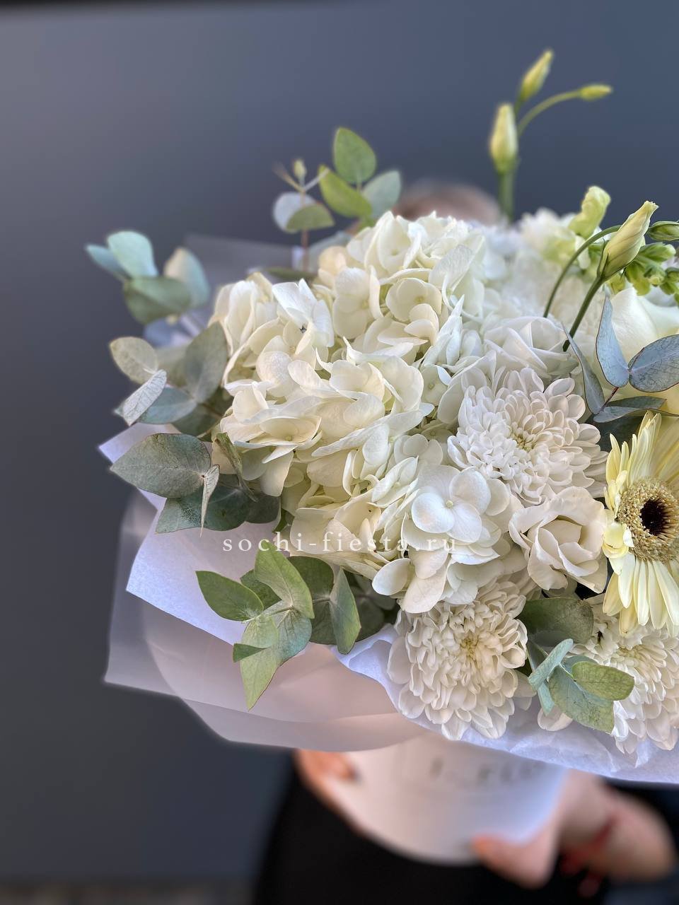 гортензия, бруния, диантусы (или эустома), пионовидная кустовая роза, эвкалипт, дизайнерское оформление.