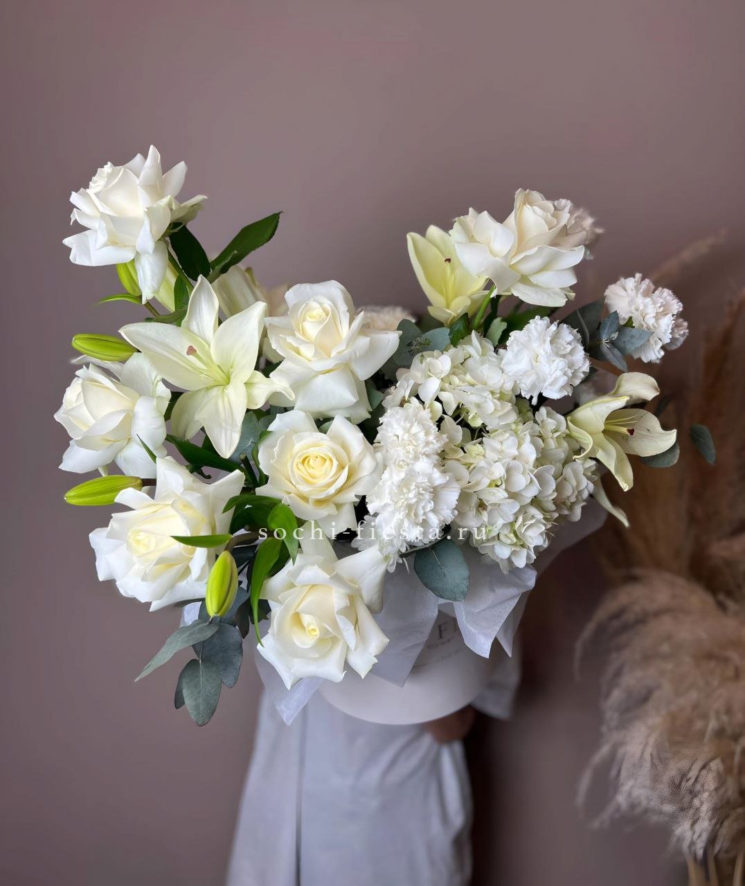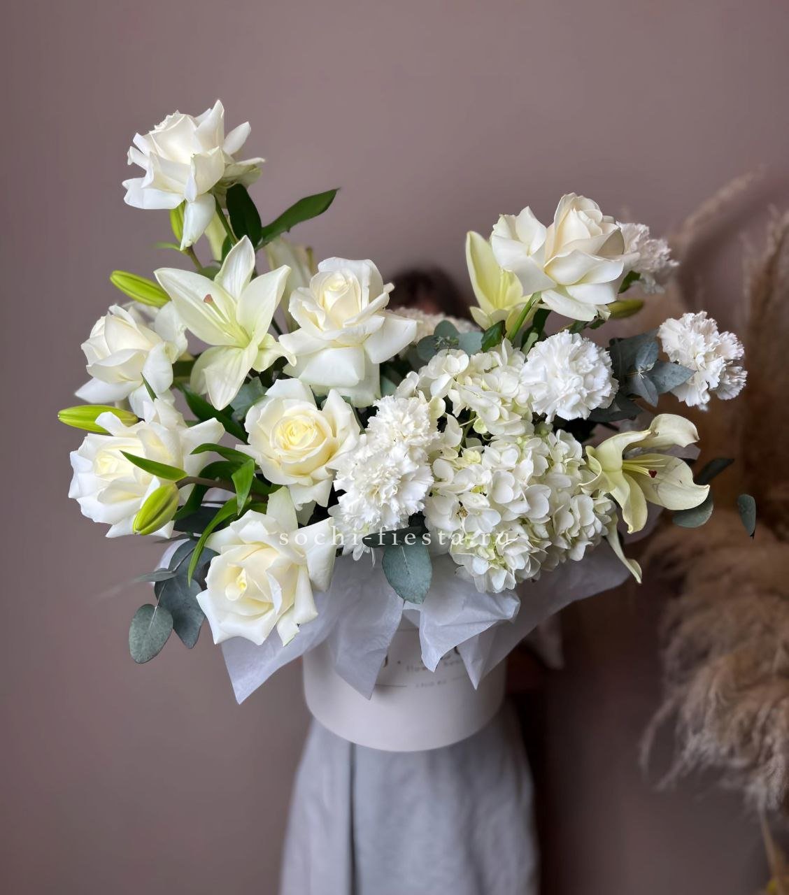 Плотная сборка с открытыми бутонами роз и воздушными соцветиями гортензии создаёт многослойную композицию. Белые каллы и маттиола добавляют вертикальные линии, а эвкалипт смягчает переходы между крупными формами.