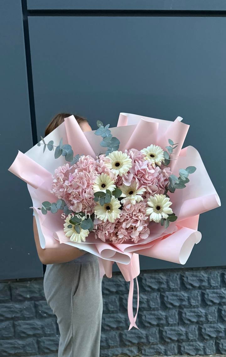гортензия, диантус, мисти бабблс, астильба или аналог, гербера, кустовая роза, бовардия, эустома, эвкалипт, авторская упаковка, лента.