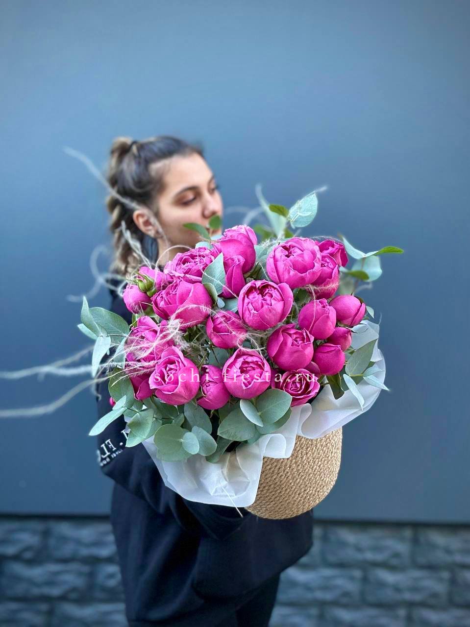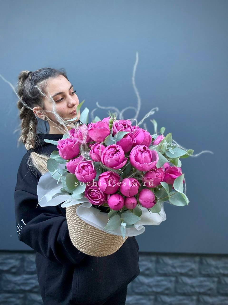 пионы, лилии, белые розы, эустомы, диантусы, маттиолы, статица, альстромерия, эвкалипт, цилиндр - D25, лента, упаковка. Состав может меняться в зависимости от сезона.
