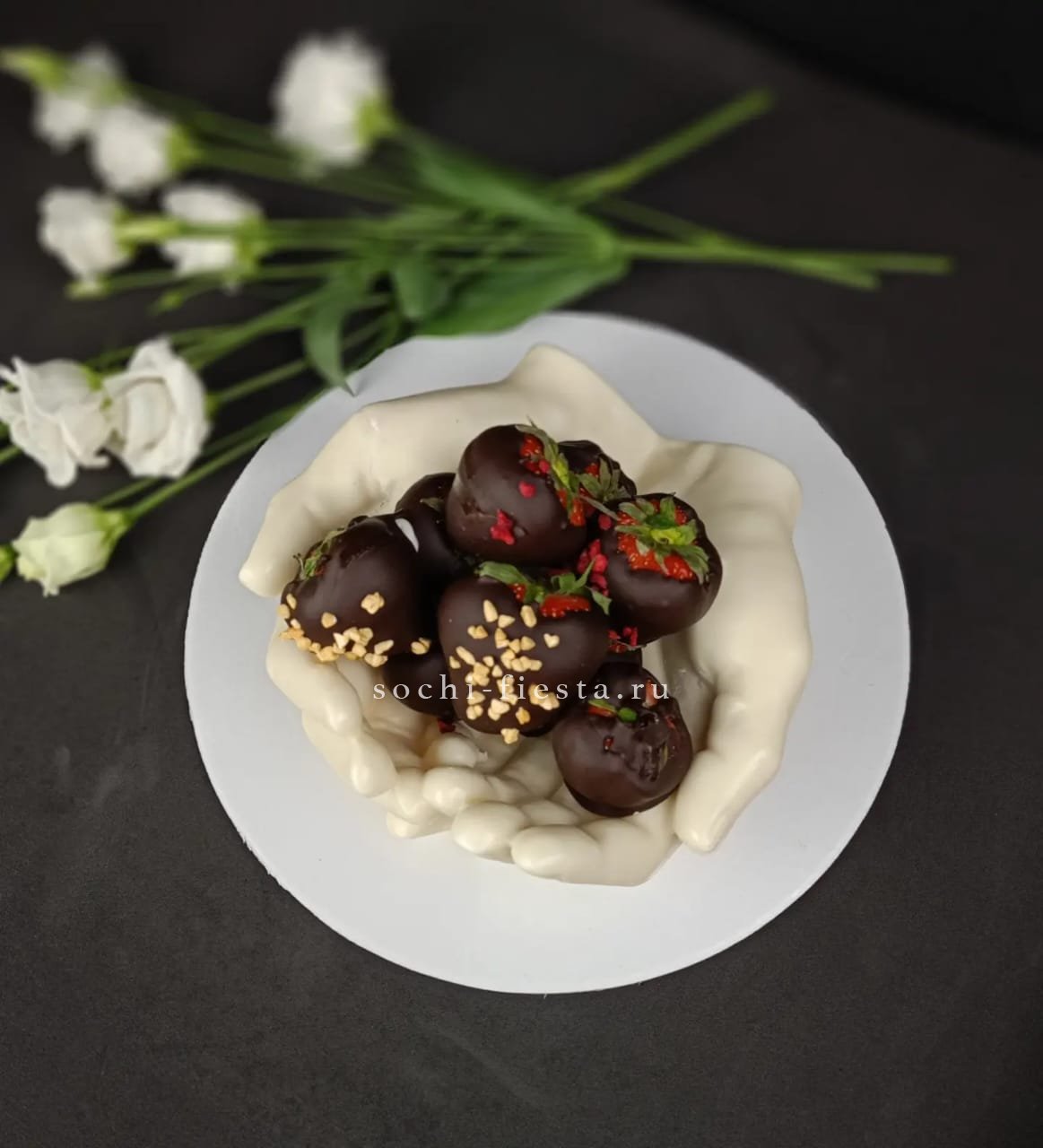 Свежая клубника в бельгийском шоколаде размещена на ладонях из того же материала с жестом мира. Посыпка из орехов или конфетти добавляет текстурный акцент каждой ягоде.