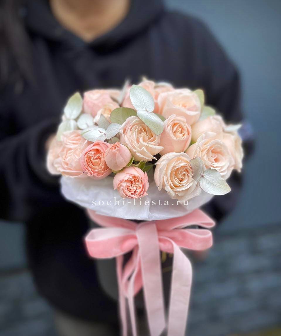 кустовые пионовидные розы Бомбастик, эвкалипт, цилиндр D13, бумага тишью, лента.