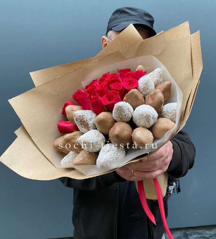 21 клубника в шоколаде, розы- 15шт., лента, оформление.