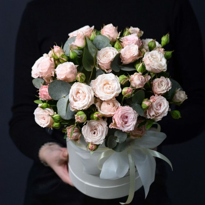 цветочная композиция, выполненная в бежевом цилиндре диаметром 20 см.