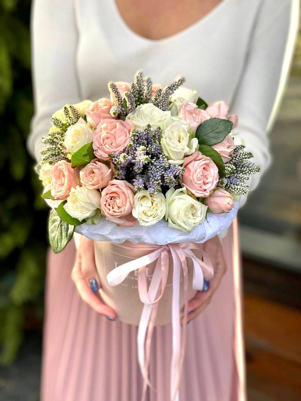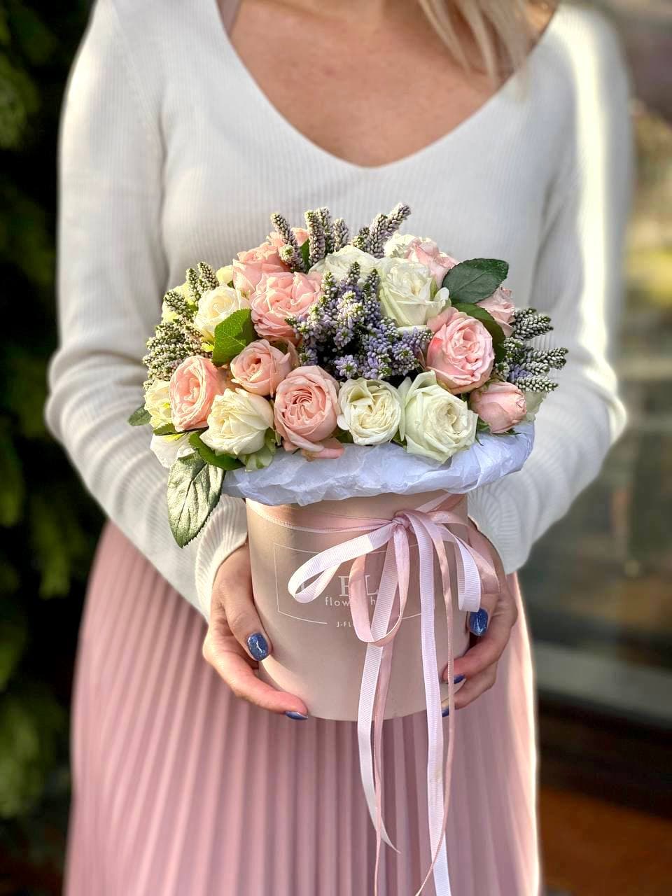 бокс из нежных розово-голубых цветов, розы, герберы, гортензии.