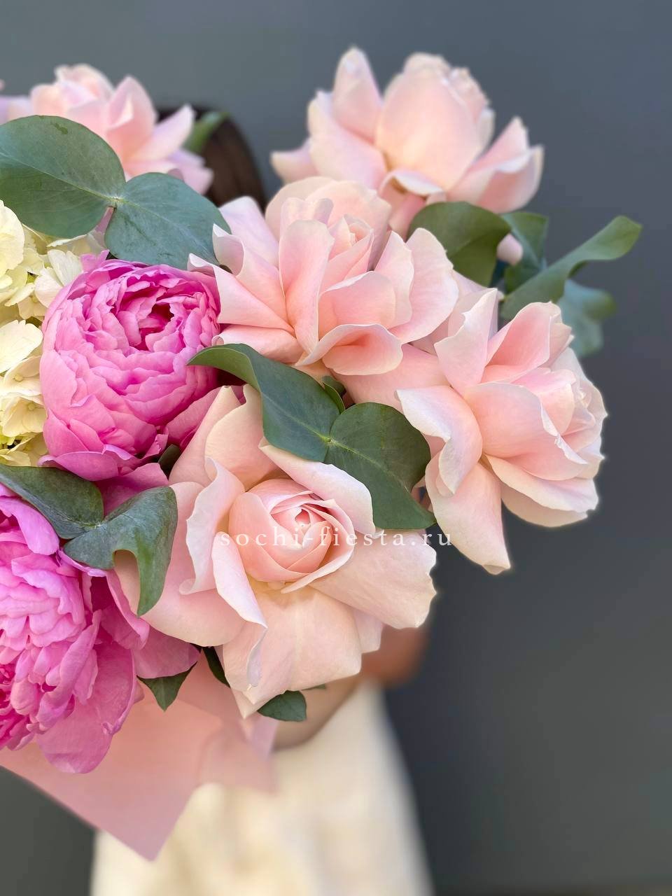 Пионы и гортензии наполняют композицию объемом и мягкой фактурой лепестков. Цилиндр собирает цветы в плотную форму, где каждый бутон находит свое место в общем движении.
