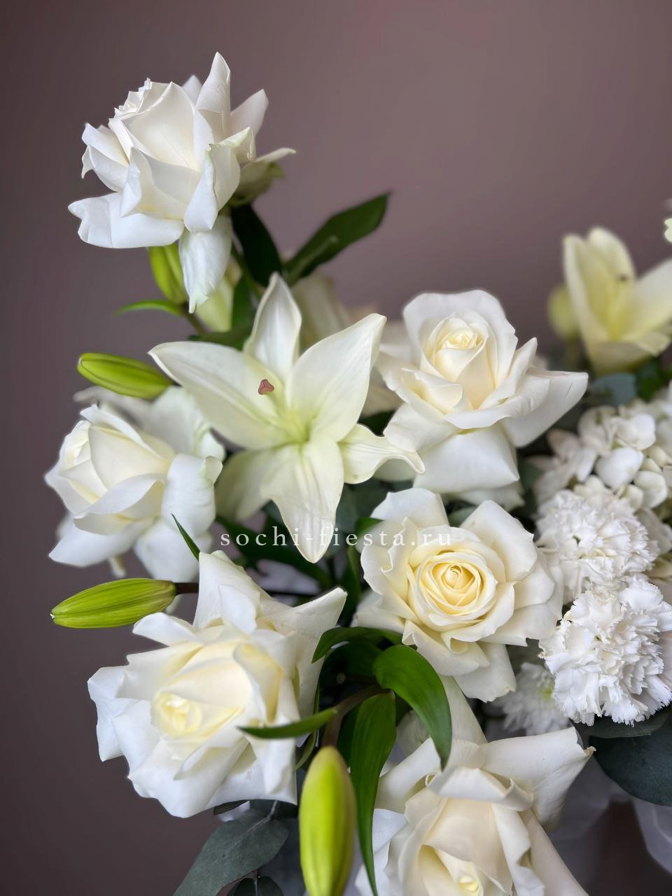 Белоснежная гамма раскрывается через лилии, розы и пышную гортензию с добавлением диантуса. Эвкалипт придает объём и глубину всей композиции в цилиндре.
