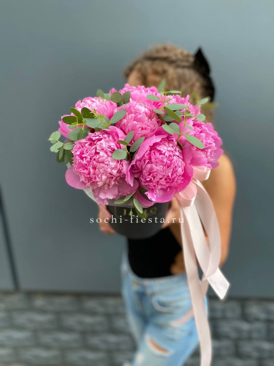 Семь пионов раскрываются пышными шапками в компактном цилиндре. Каждый бутон демонстрирует многослойную структуру лепестков, а эвкалипт обрамляет композицию лёгким серебристым кольцом.