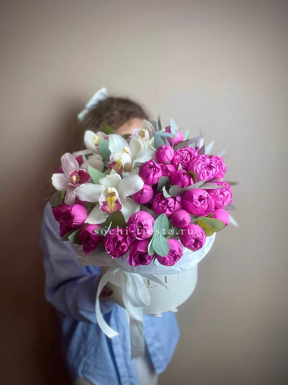 Пионовидные розы Мисти Баблс и экзотичные орхидеи Цимбидиум создают композицию с мягкими переходами оттенков. Цилиндрическая форма собирает цветы в плотную структуру с выразительным силуэтом.
