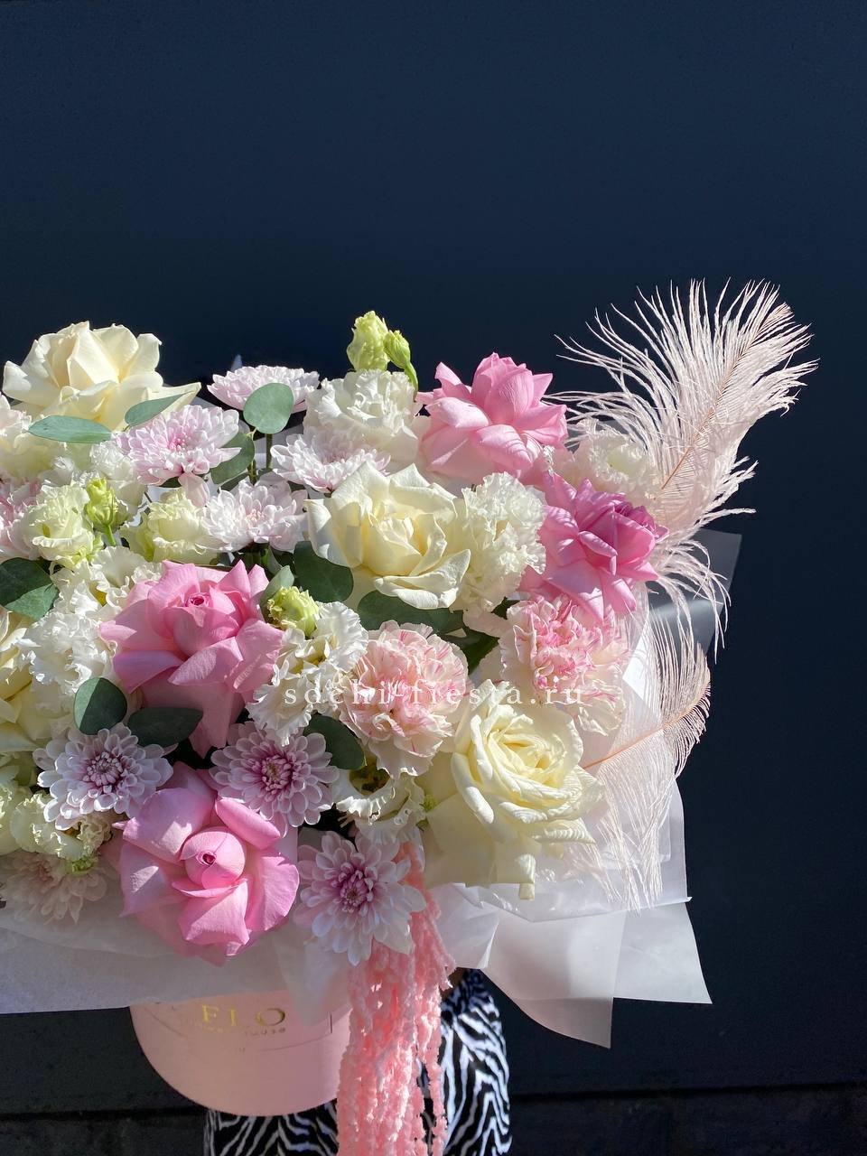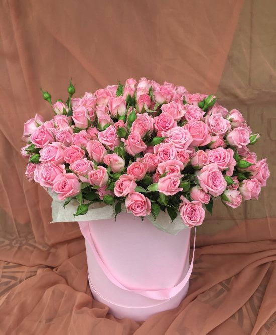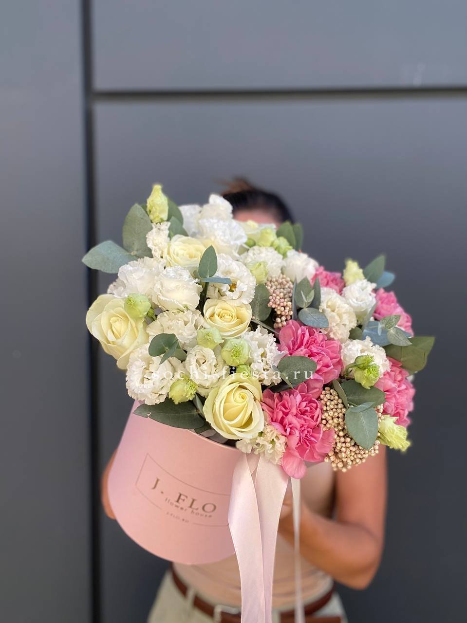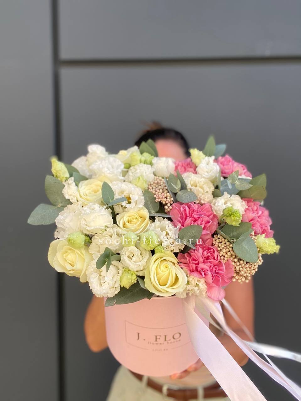 Пионовидные кустовые розы собраны плотно, создавая объёмную композицию с живой текстурой. Лимониум и эвкалипт добавляют воздушности, а цилиндр собирает всё в компактную форму.