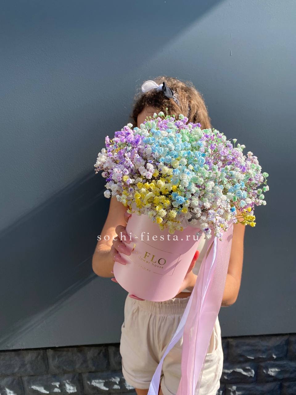 Воздушные соцветия гипсофилы переливаются радужными оттенками в компактном цилиндре. Лёгкая текстура наполняет пространство. Композиция выглядит свежо и современно.