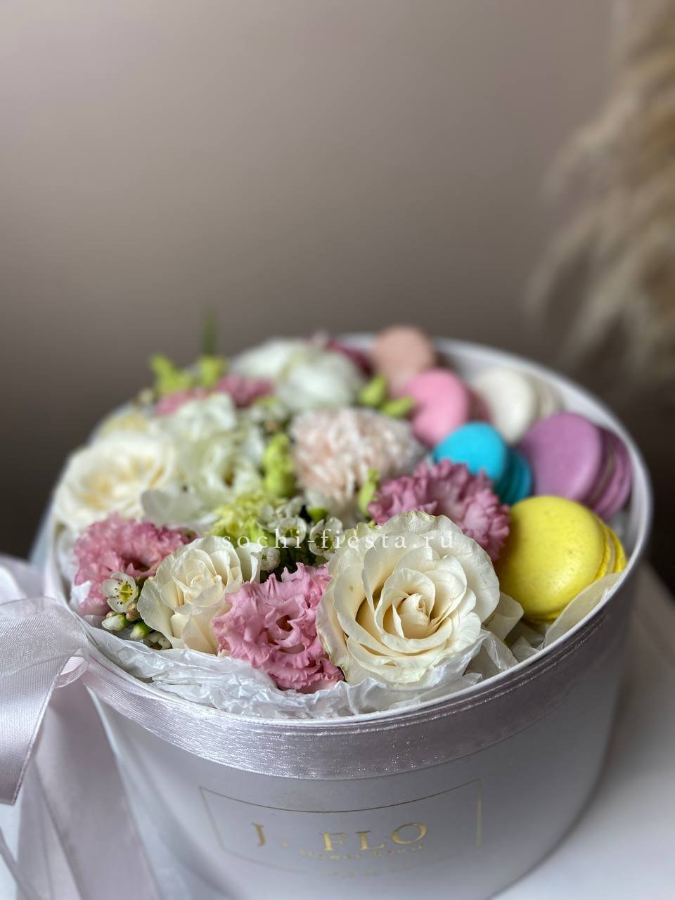 Микс сезонных цветов в цилиндре радует разнообразием бутонов и оттенков. Пять макаронс дополняют живую палитру и делают презент готовым к вручению.