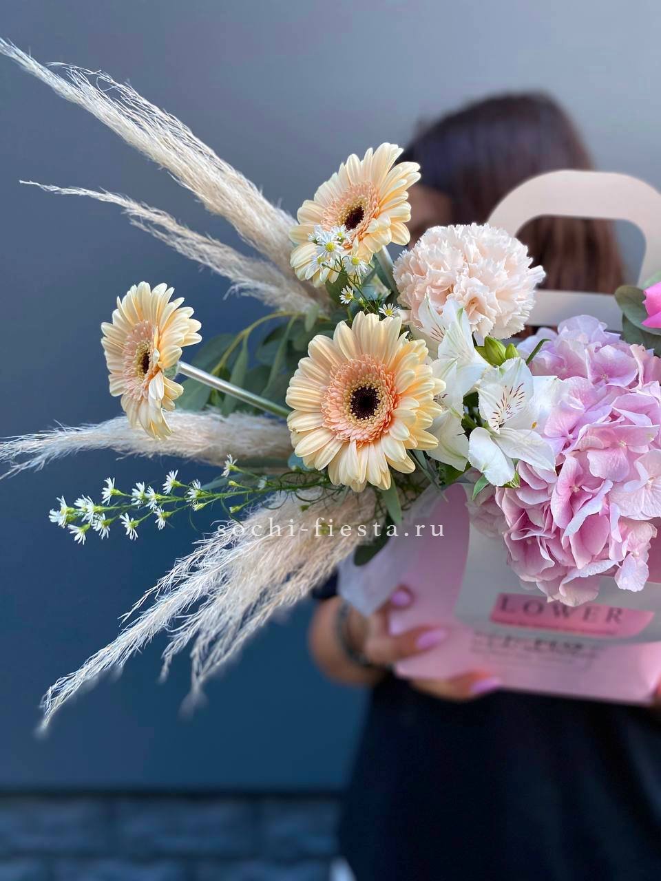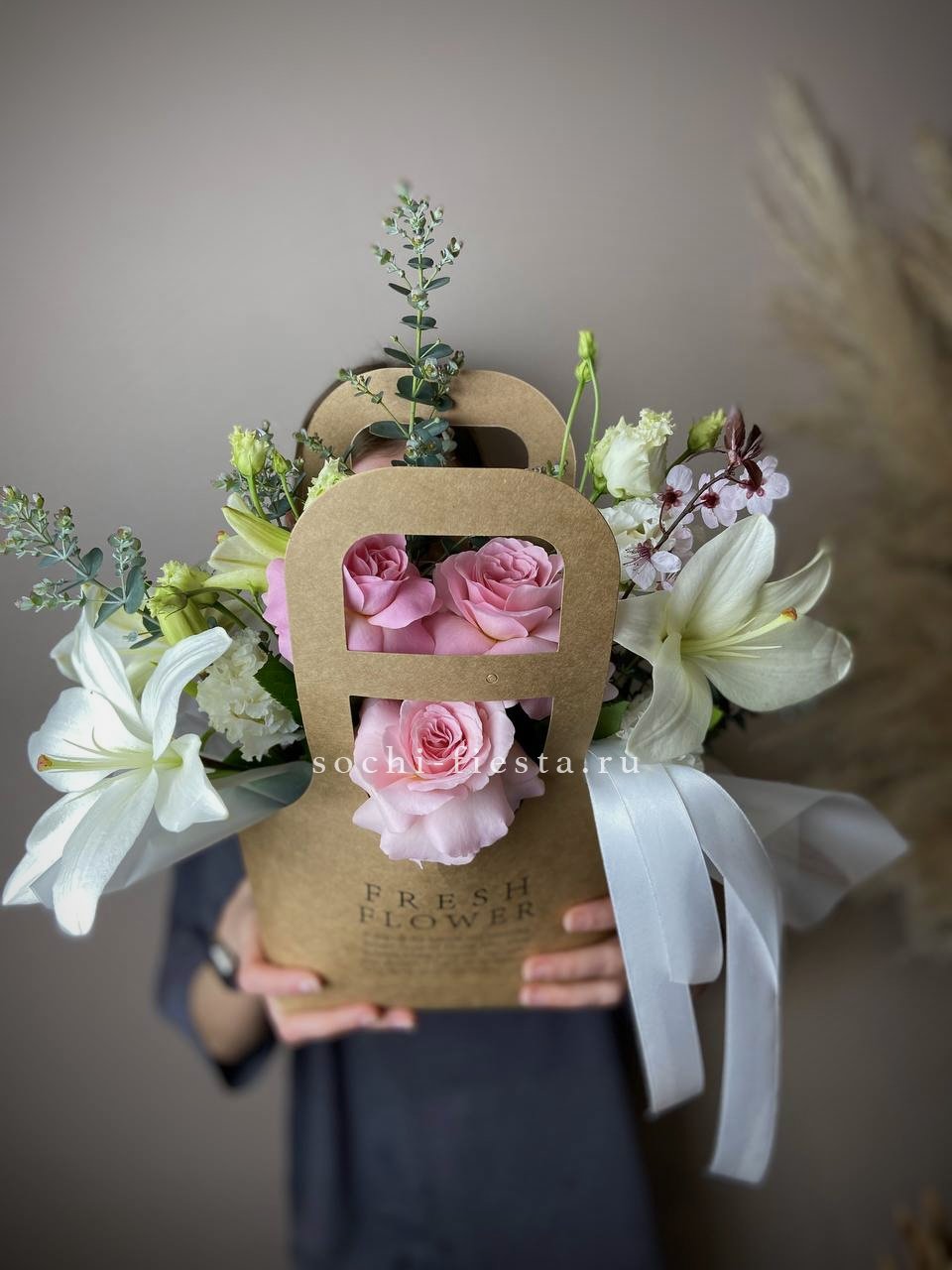 Хризантемы с пушистыми коробочками хлопка создают теплую домашнюю композицию в удобной сумочке. Цветы долго радуют взгляд и не требуют сложного ухода. Формат подходит для размещения в любом уголке дома.
