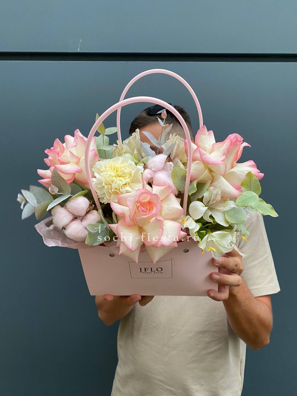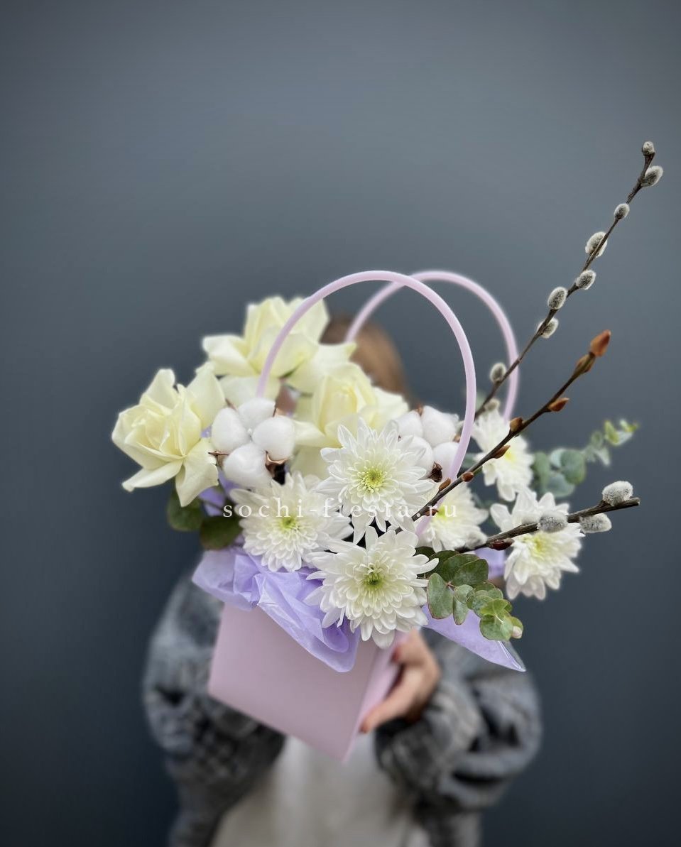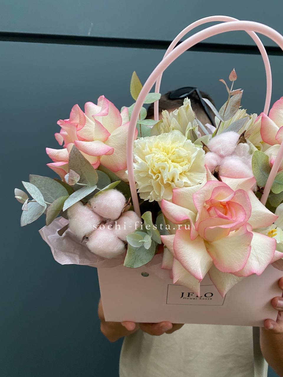 Голубая гортензия и статица задают основной тон, а кустовые розы разбавляют прохладную палитру теплыми нотами. Сумочка держит форму и выглядит собранно.