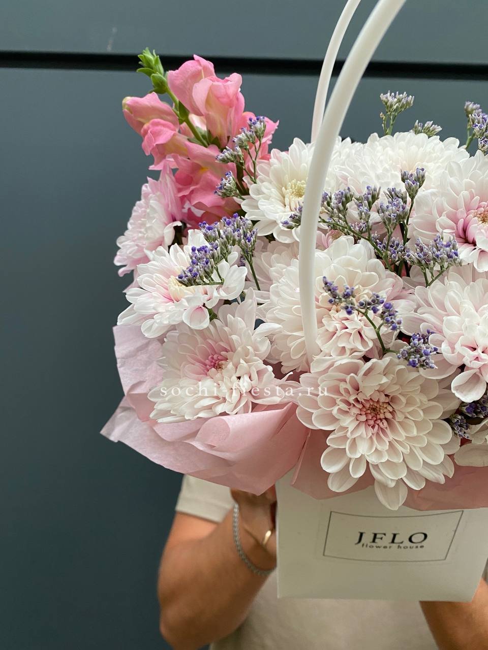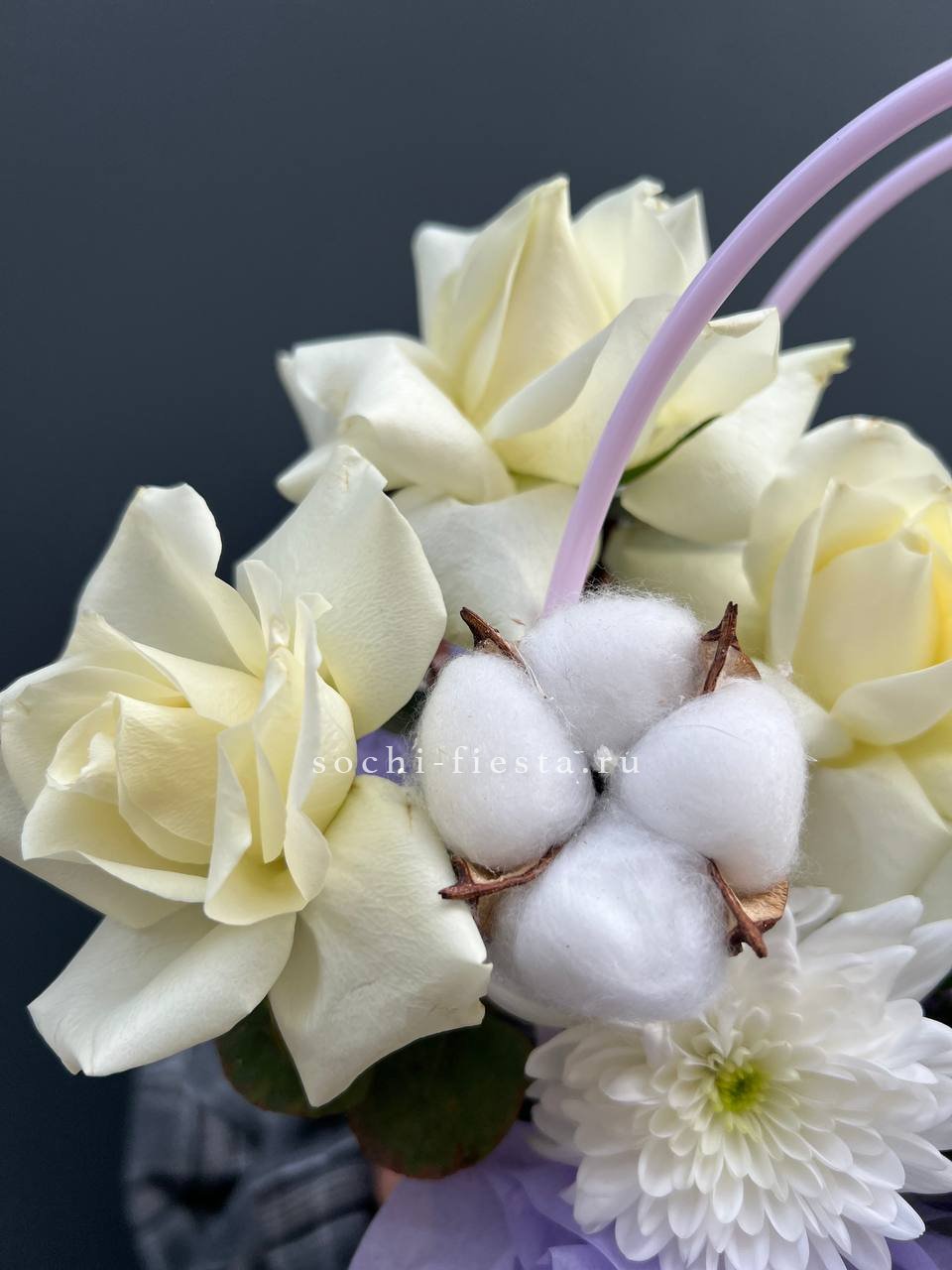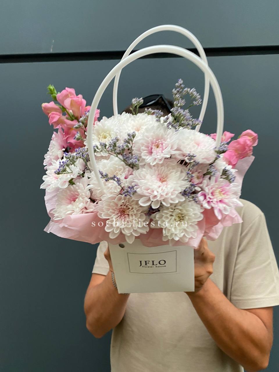 Голубая гортензия и статица задают основной тон, а кустовые розы разбавляют прохладную палитру теплыми нотами. Сумочка держит форму и выглядит собранно.