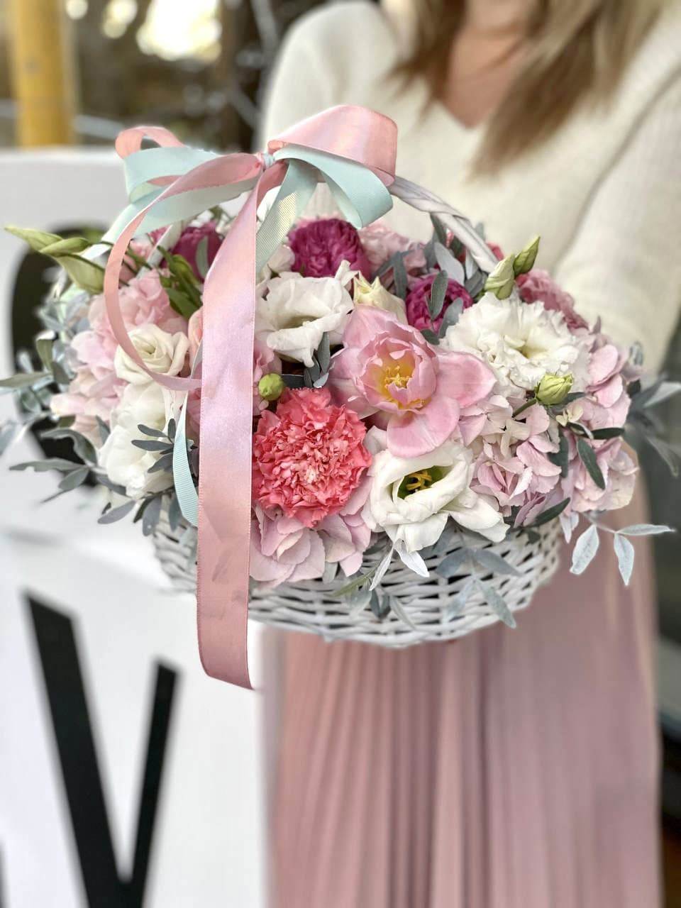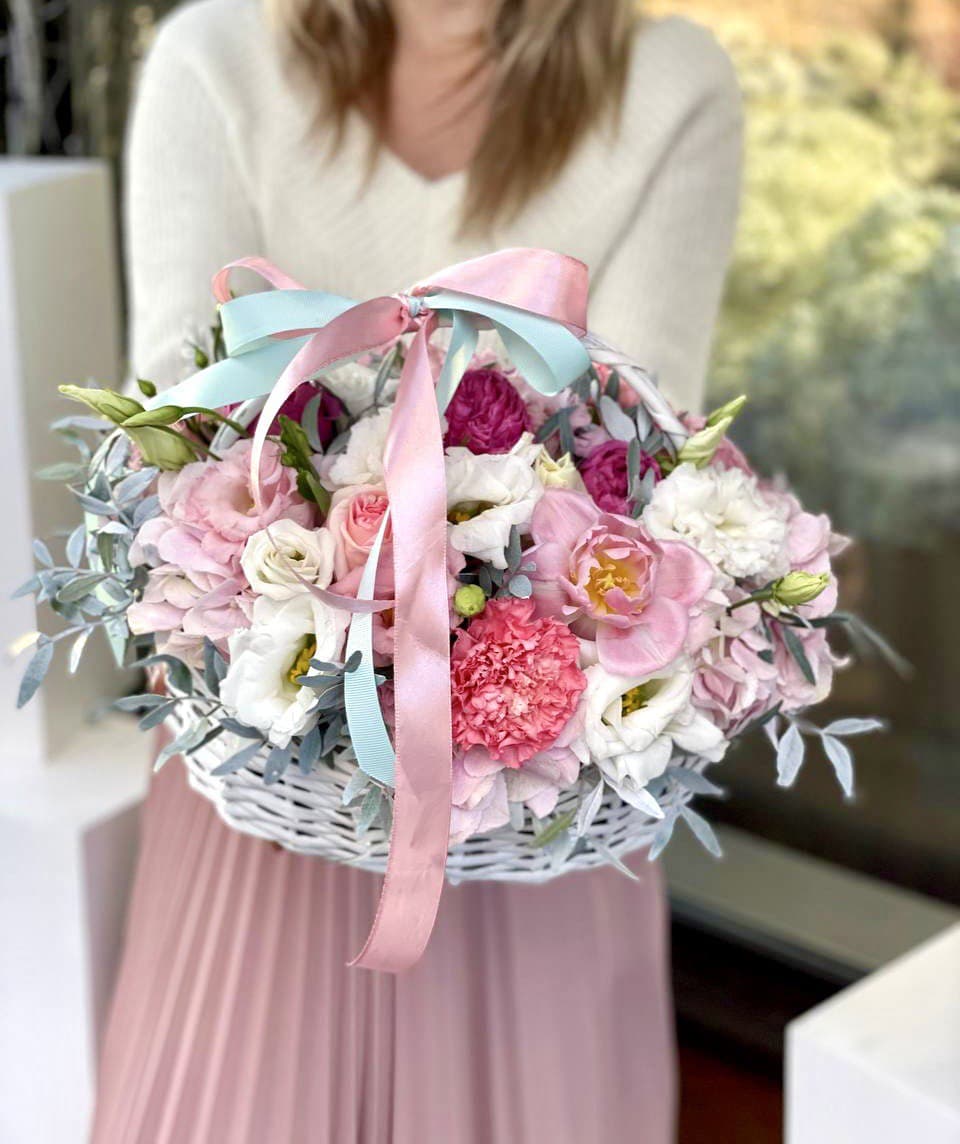 цветочная корзина с розами, мисти баблс, диантусами и гортензией.