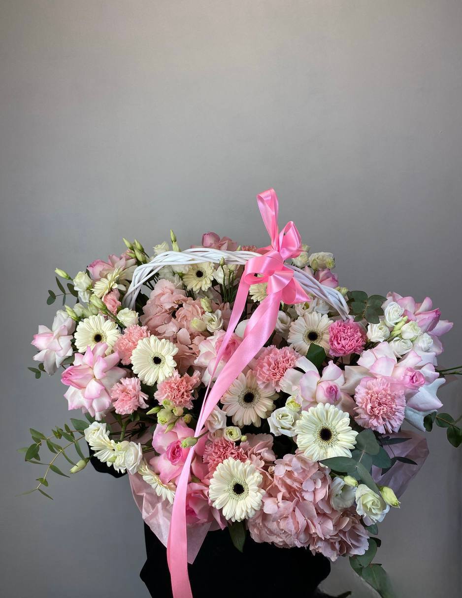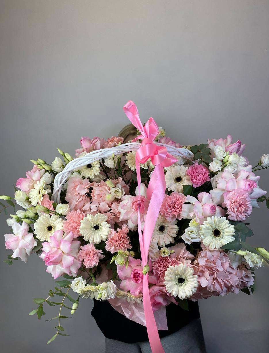 Пышная корзина с розами и гортензией раскрывается мягкими переходами розовых тонов. Эустома и диантус добавляют воздушности, а эвкалипт создает свежую основу для многослойной композиции. Авторская работа для важных событий и значимых встреч.