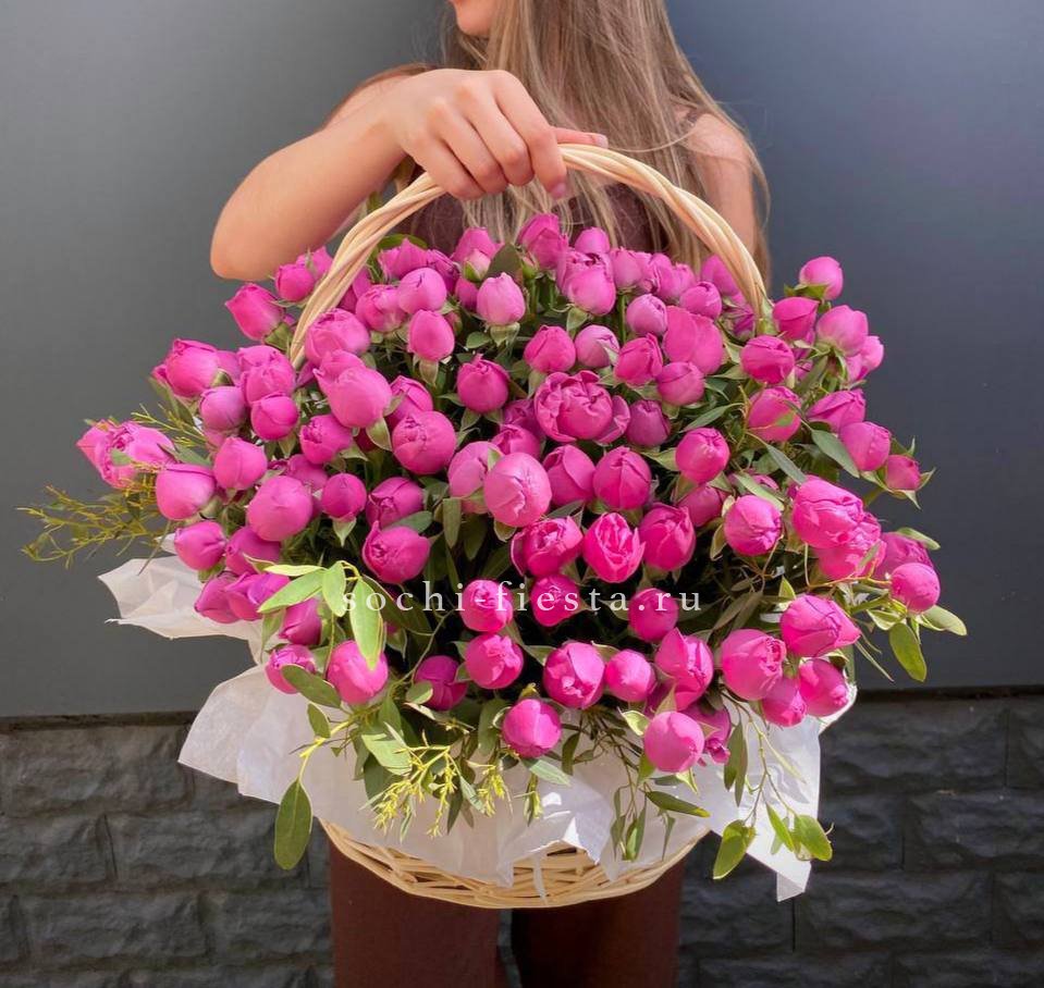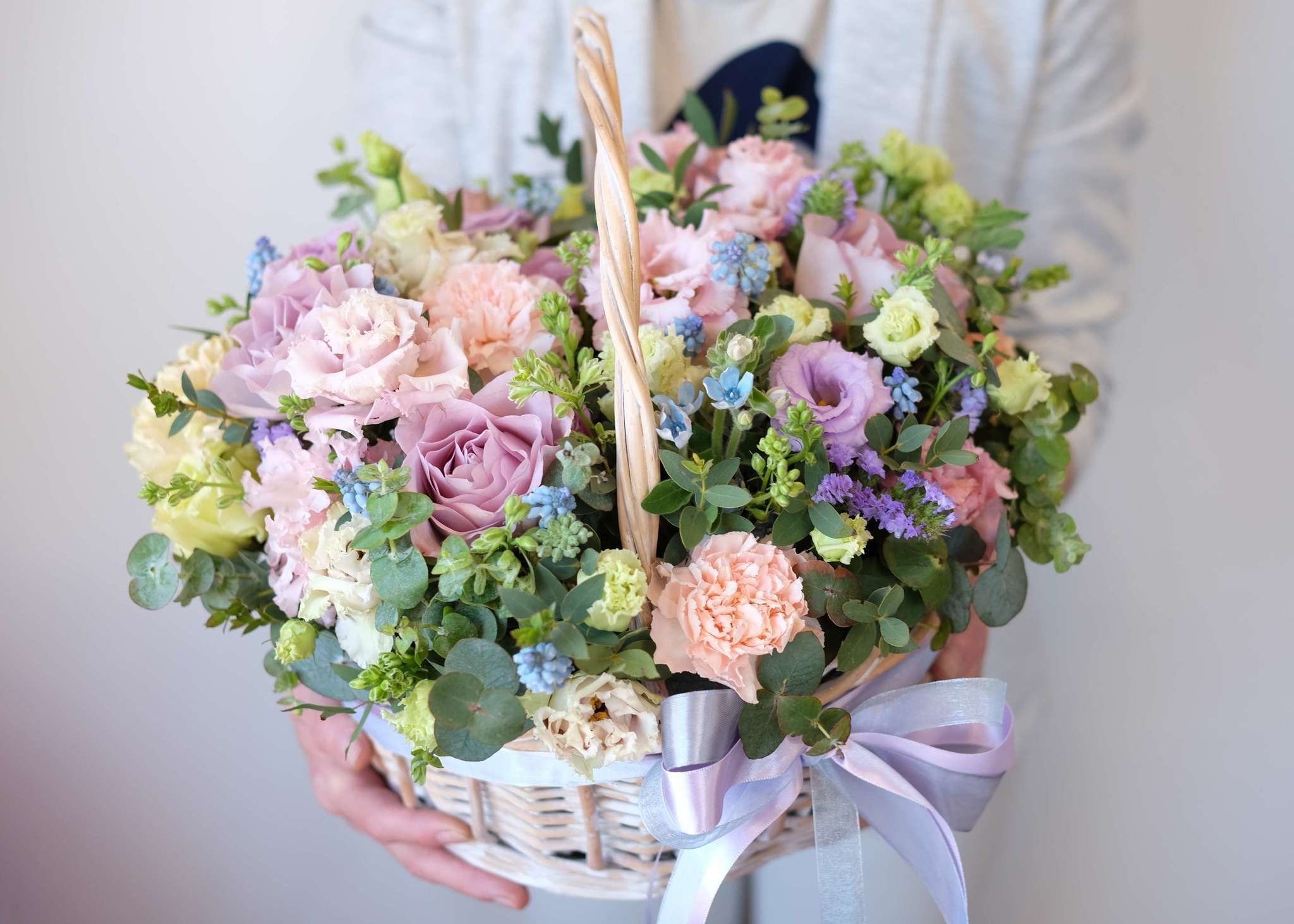 Пышная корзина объединяет пионовидные розы с воздушной гортензией и многослойной эустомой. Матиолла и лимониум добавляют глубину композиции, а диантус создает мягкие переходы между крупными бутонами.