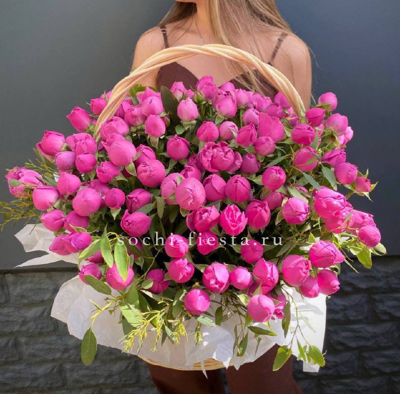 Букет сохраняет свежесть и форму благодаря устойчивой основе корзины.