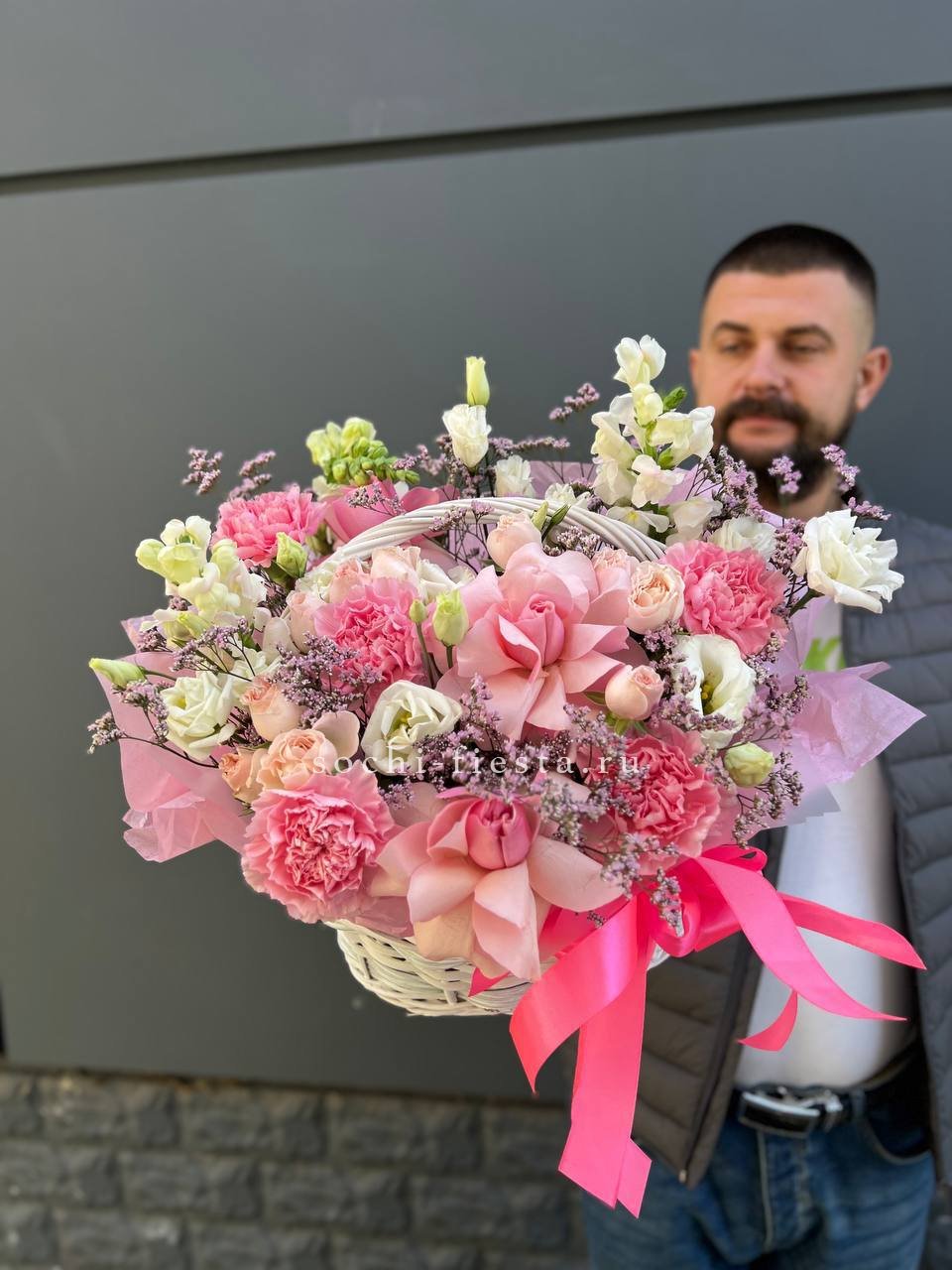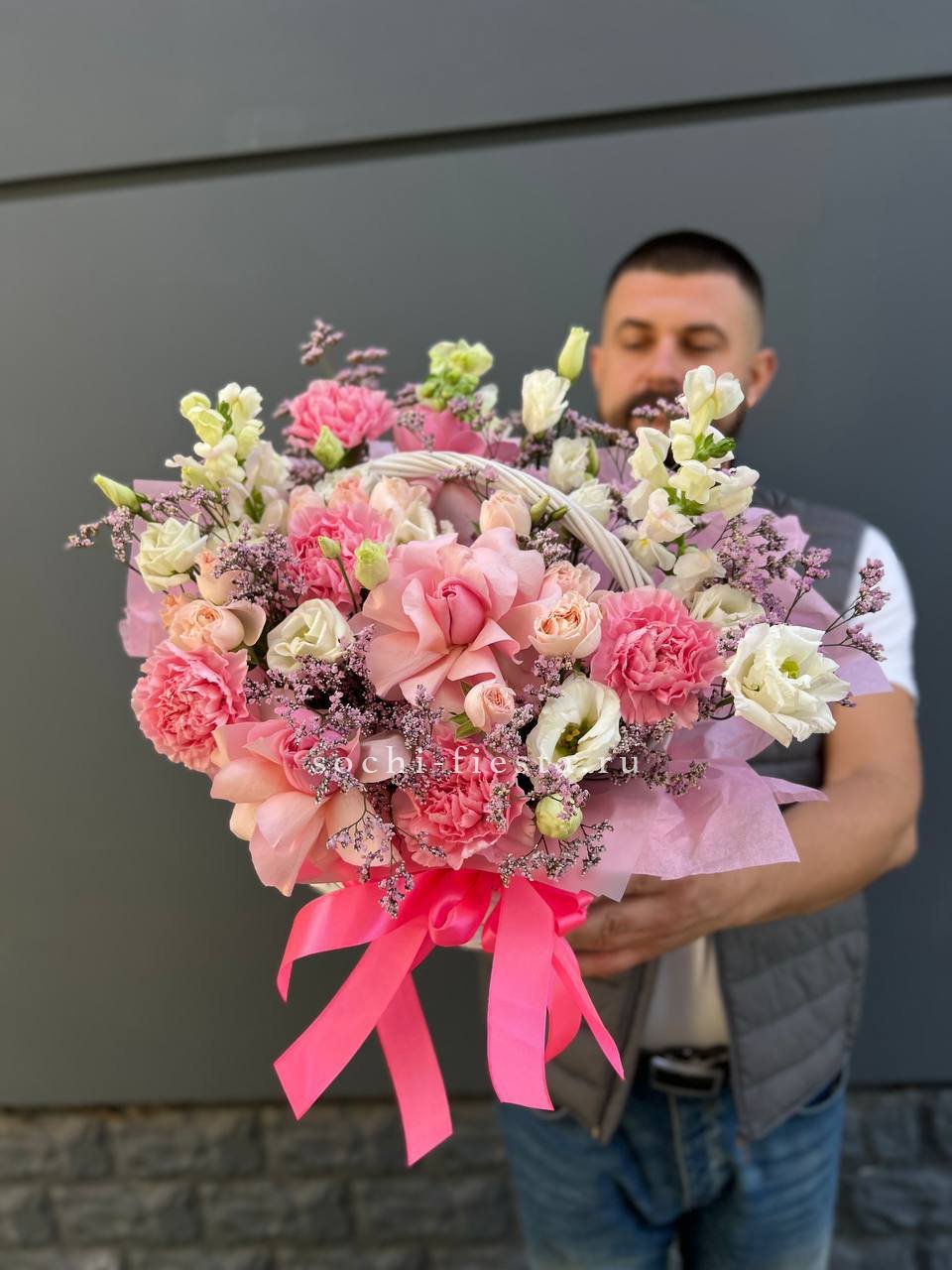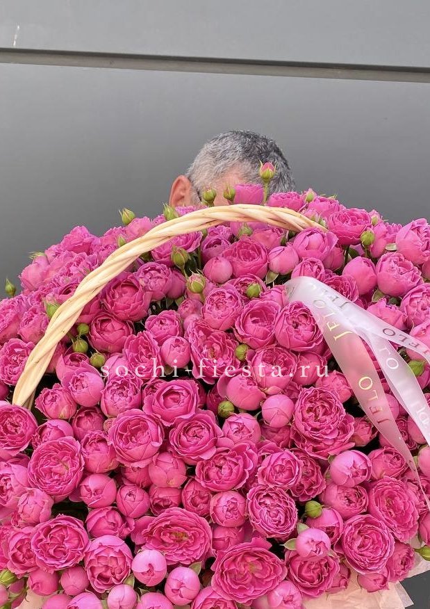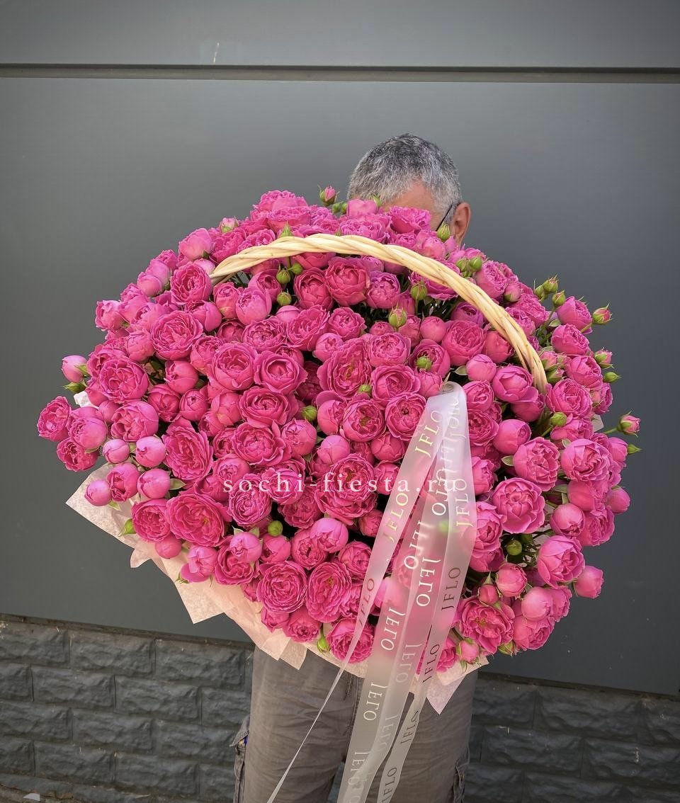 Пышные пионовидные розы Мисти Баблс и бомбастик создают объёмное облако в естественной плетёной корзине. Диантусы и статица добавляют воздушности, а эвкалипт завершает композицию свежими нотами. Яркое присутствие в любом пространстве.