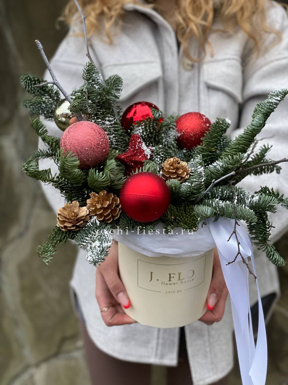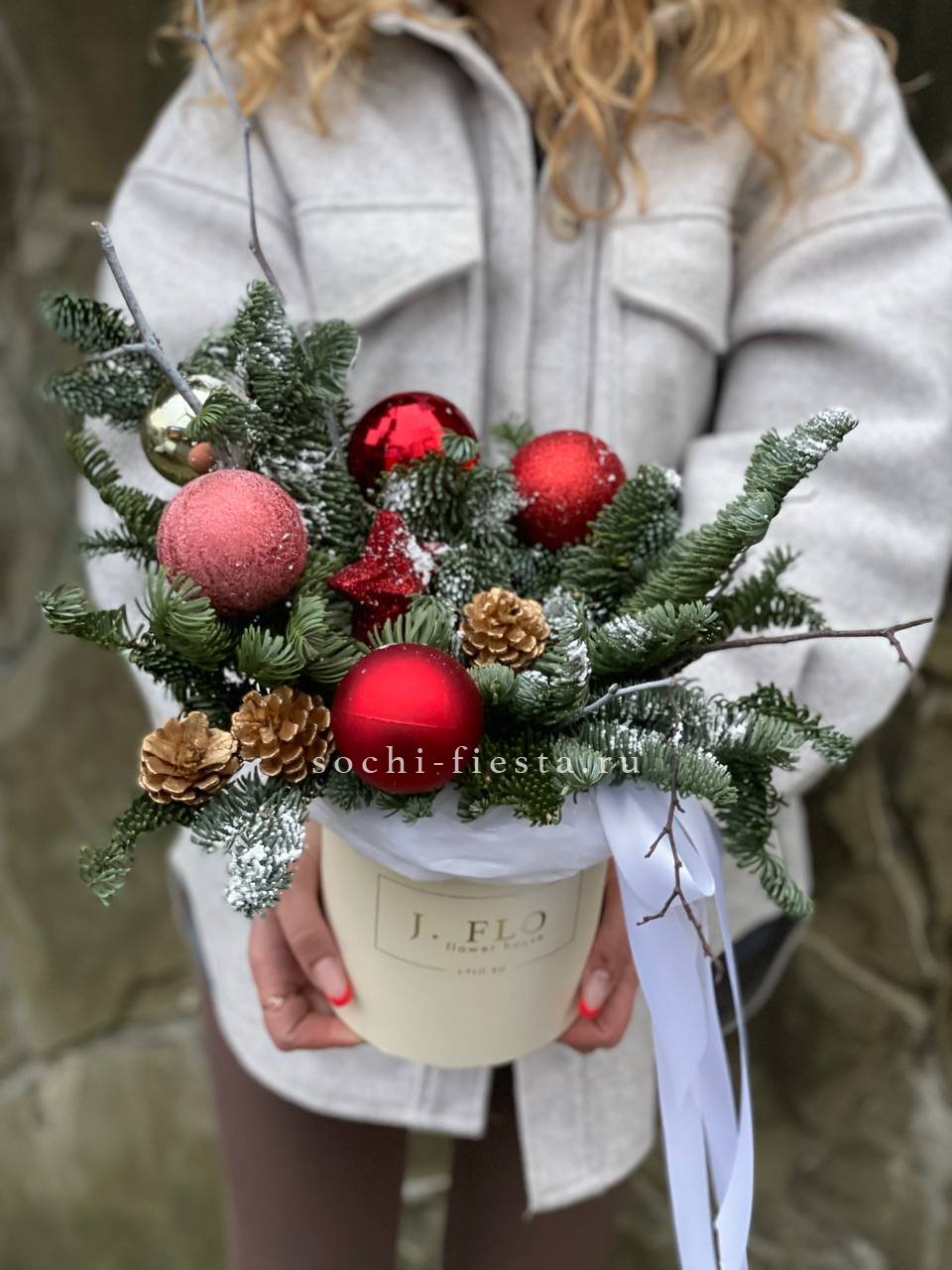 датский нобилис, игрушки, шишки, тишью, оазис, бокс, лента Готовая композиция может иметь незначительные внешние отличия от примера на фотографии.
