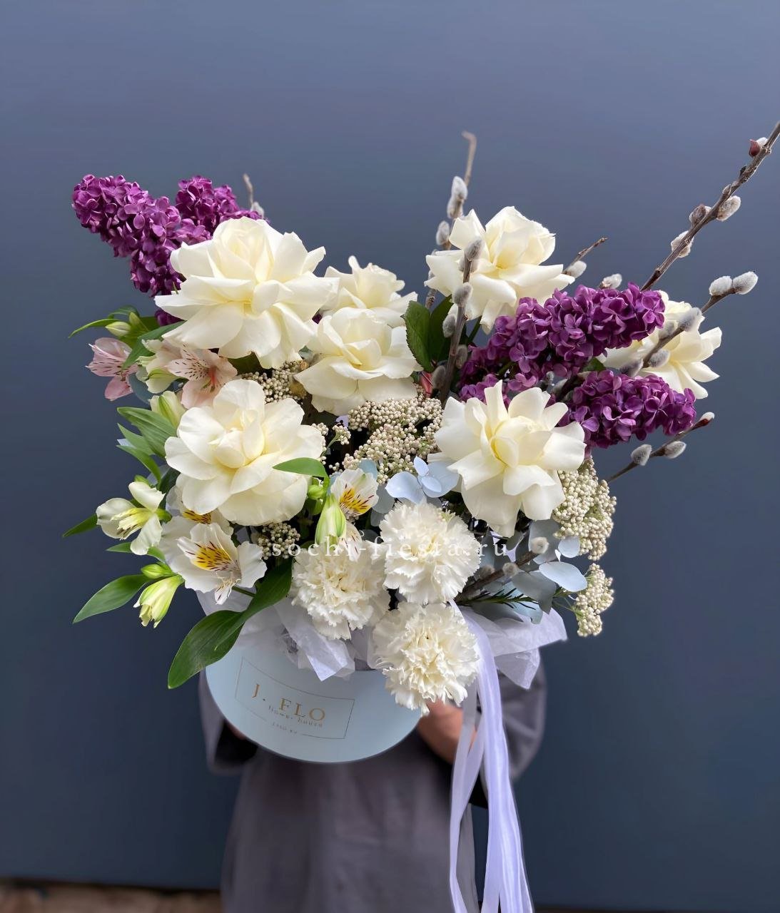 Весенняя композиция объединяет пушистые ветви вербы с бутонами белых роз и соцветиями сирени. Диантусы и озотамнус создают объёмную текстуру, а сама форма бокса делает композицию устойчивой и завершённой. Подходит для светлых праздников и семейных встреч.