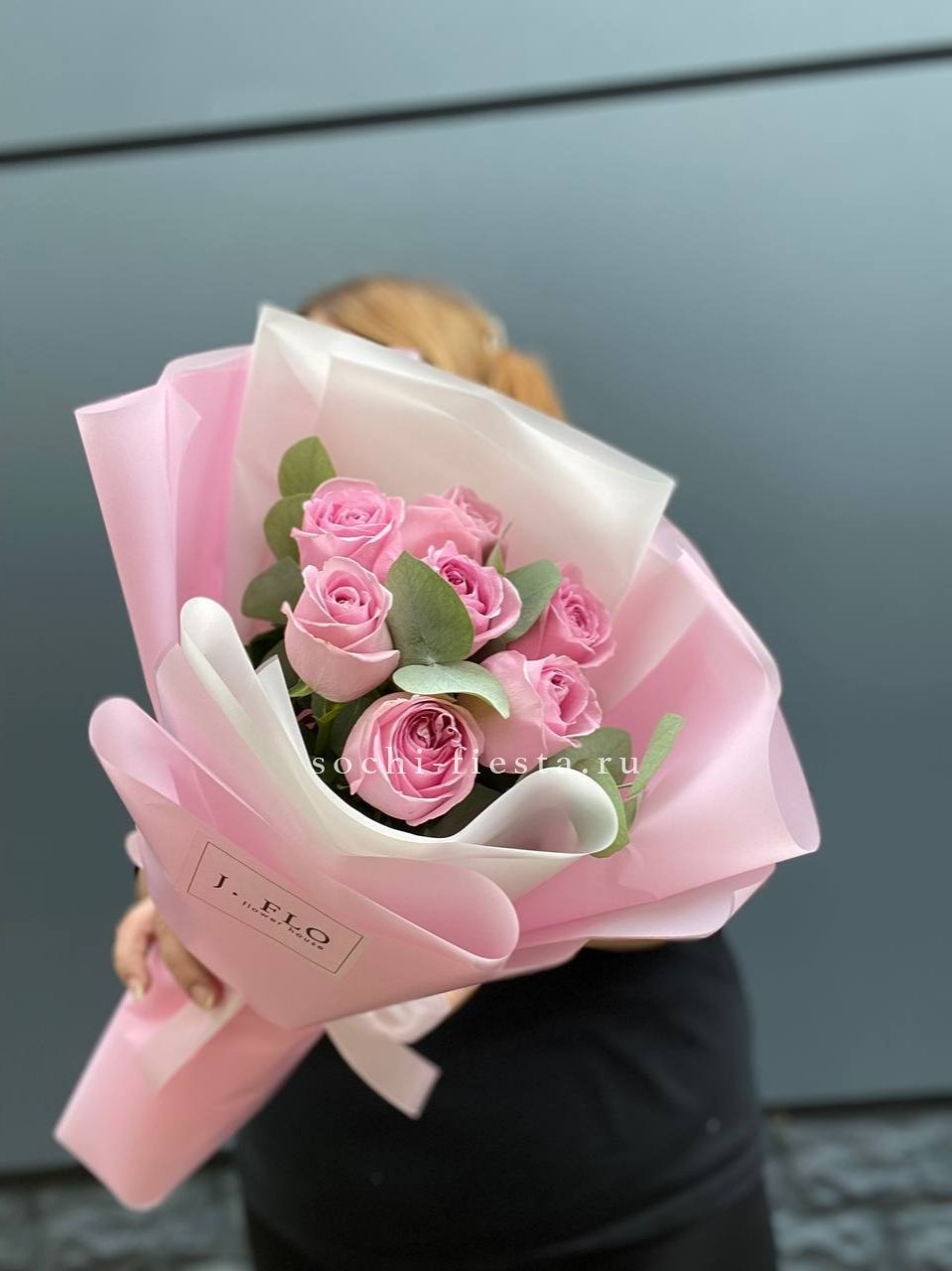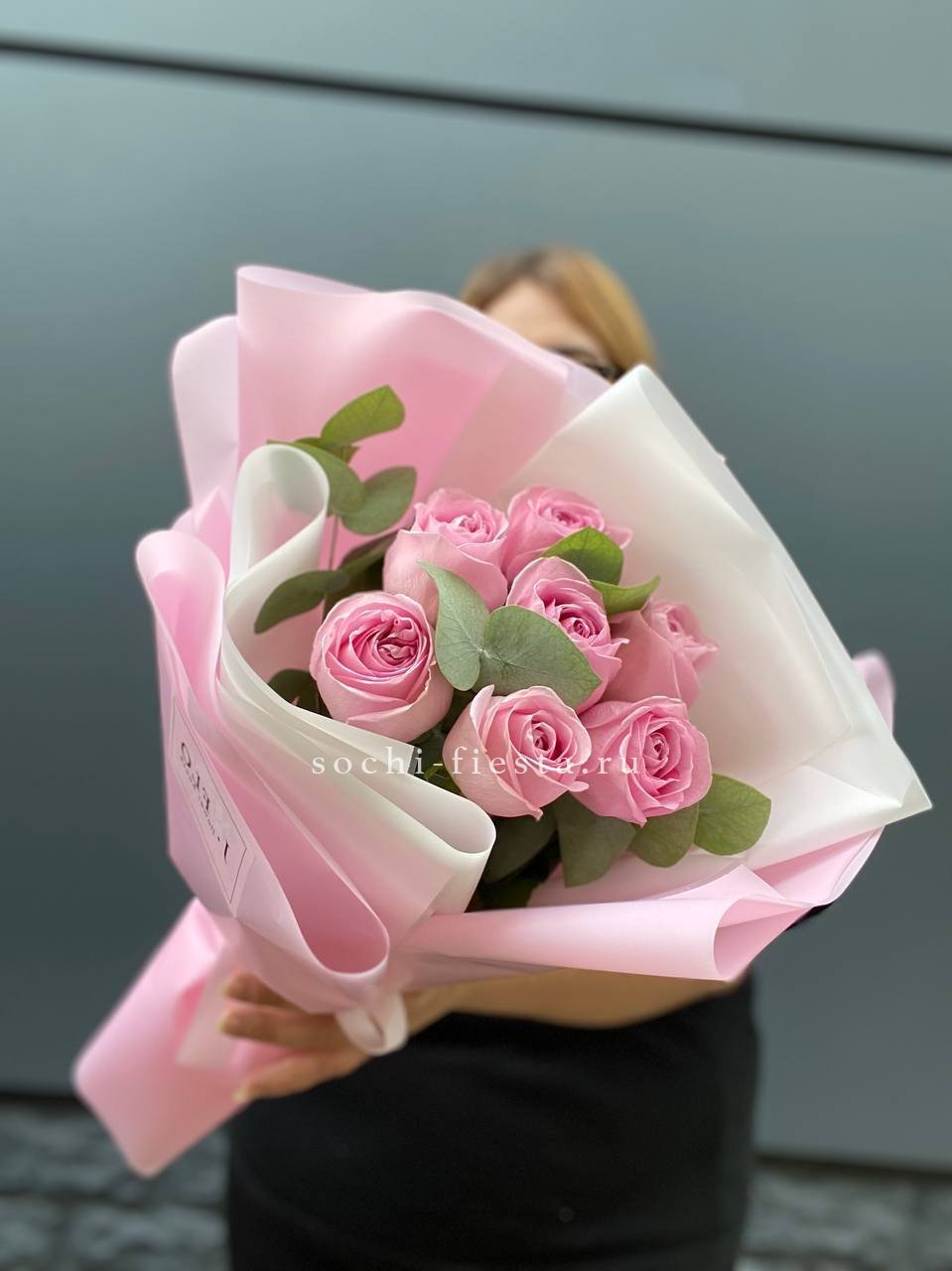 Семь пионовидных роз образуют компактный букет с мягкими линиями и спокойным ритмом. Ветви эвкалипта добавляют воздушности и завершают композицию.