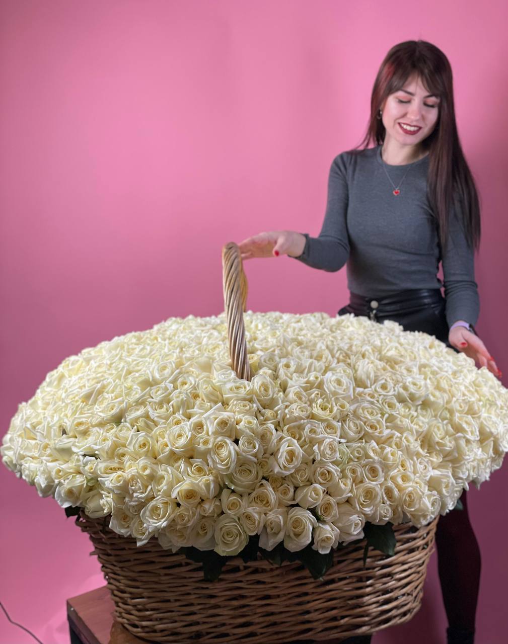 Пятьсот одна роза образует форму сердца из белых и красных бутонов. Плотная композиция в корзине удерживает симметрию и объём без дополнительных конструкций. Готовое решение для выражения чувств в масштабной форме.