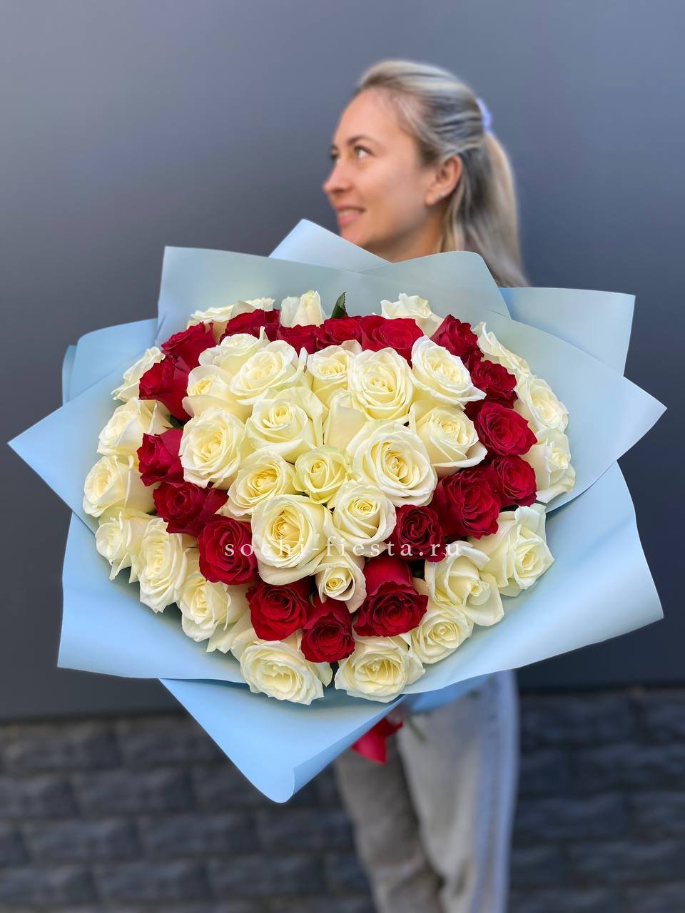 Белые и красные розы переплетаются в динамичной игре света и тени. Двадцать семь бутонов создают живописный рисунок, где каждый цвет усиливает звучание другого без лишних слов.