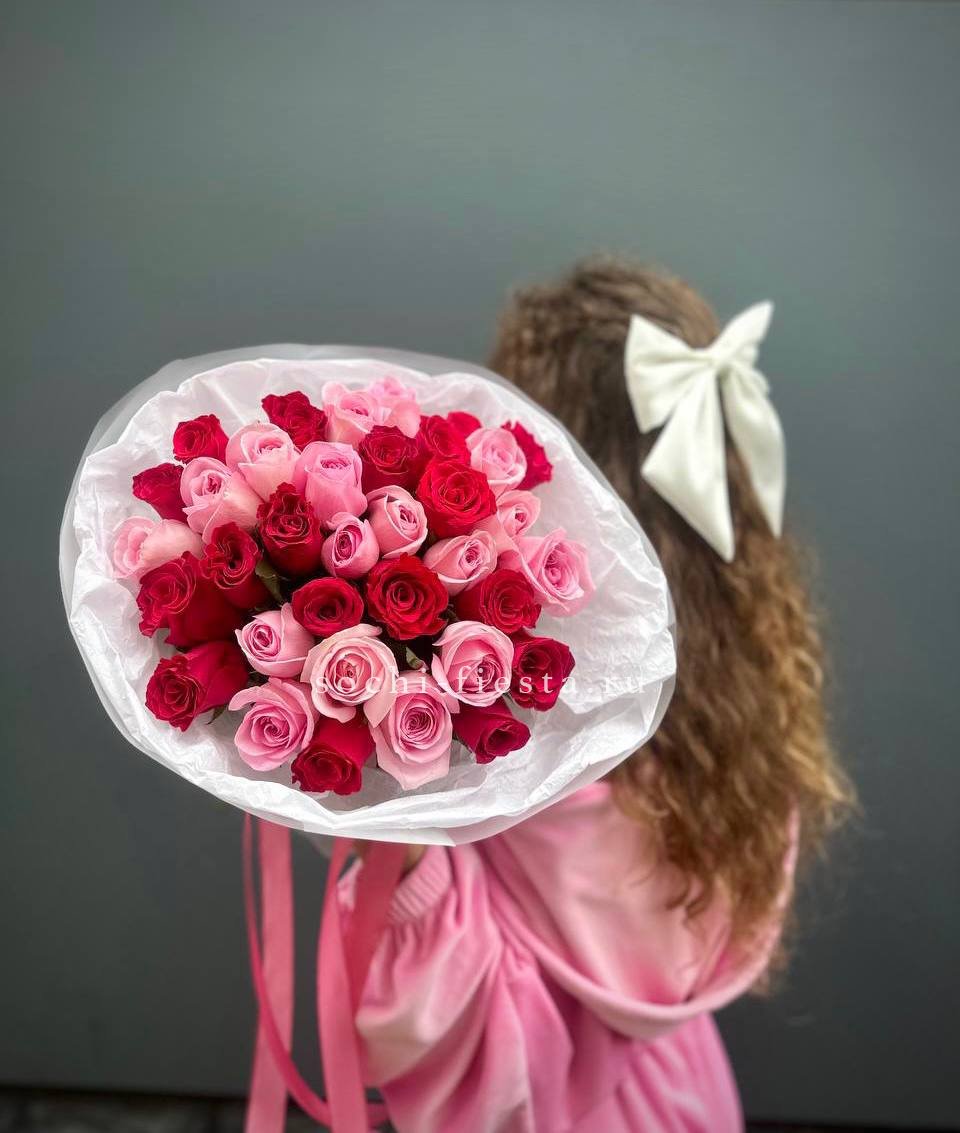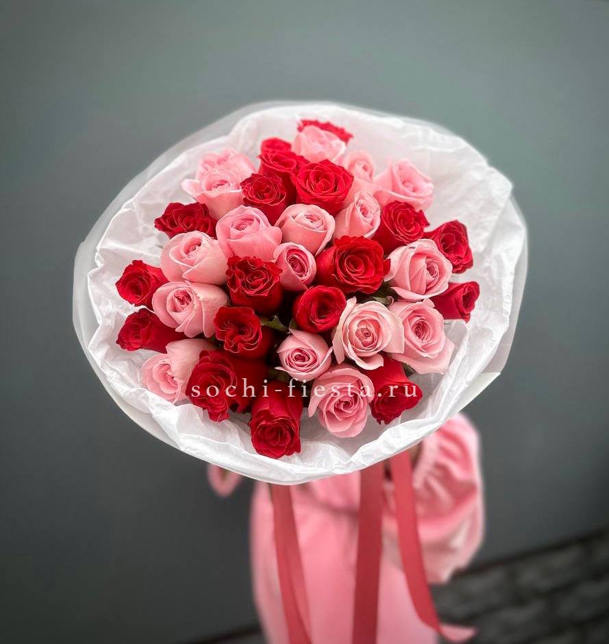 Тридцать пять роз в красных и розовых тонах создают объёмную композицию с заметным присутствием. Букет заполняет пространство цветом и притягивает внимание с первого мгляда.