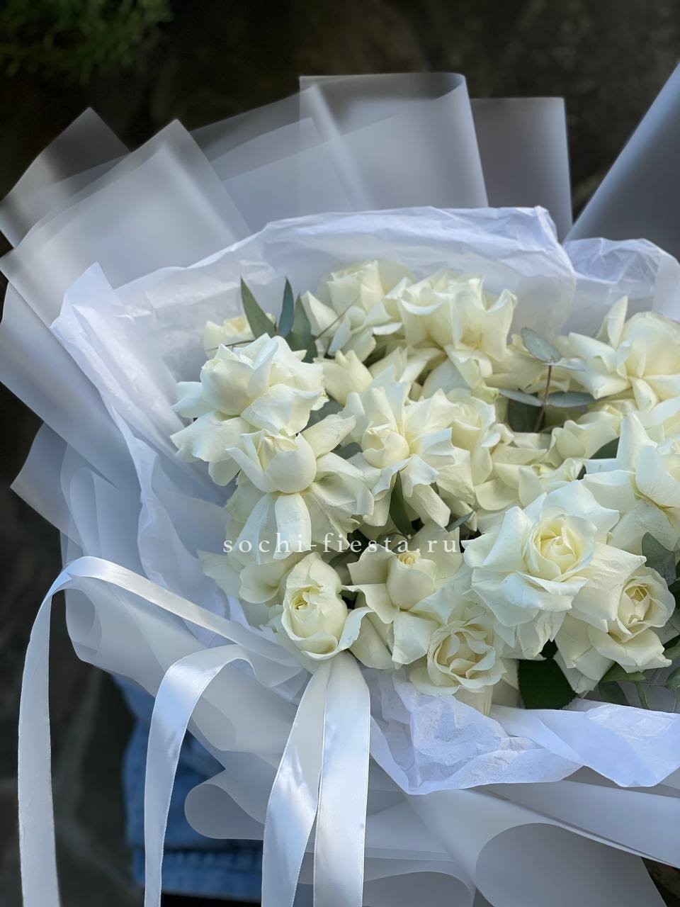 Двадцать пять белых роз образуют объёмную композицию с выразительным силуэтом. Плотная сборка и ритмичное расположение бутонов создают графичное впечатление.