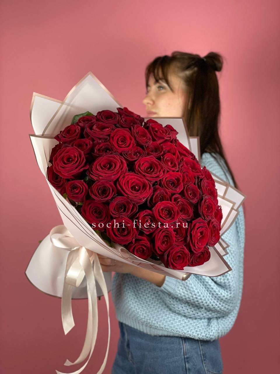 Плотная сборка из пятидесяти одной розы создает насыщенное красное пятно с глубокой фактурой лепестков. Дизайнерская упаковка удерживает форму и добавляет графичности общему силуэту.