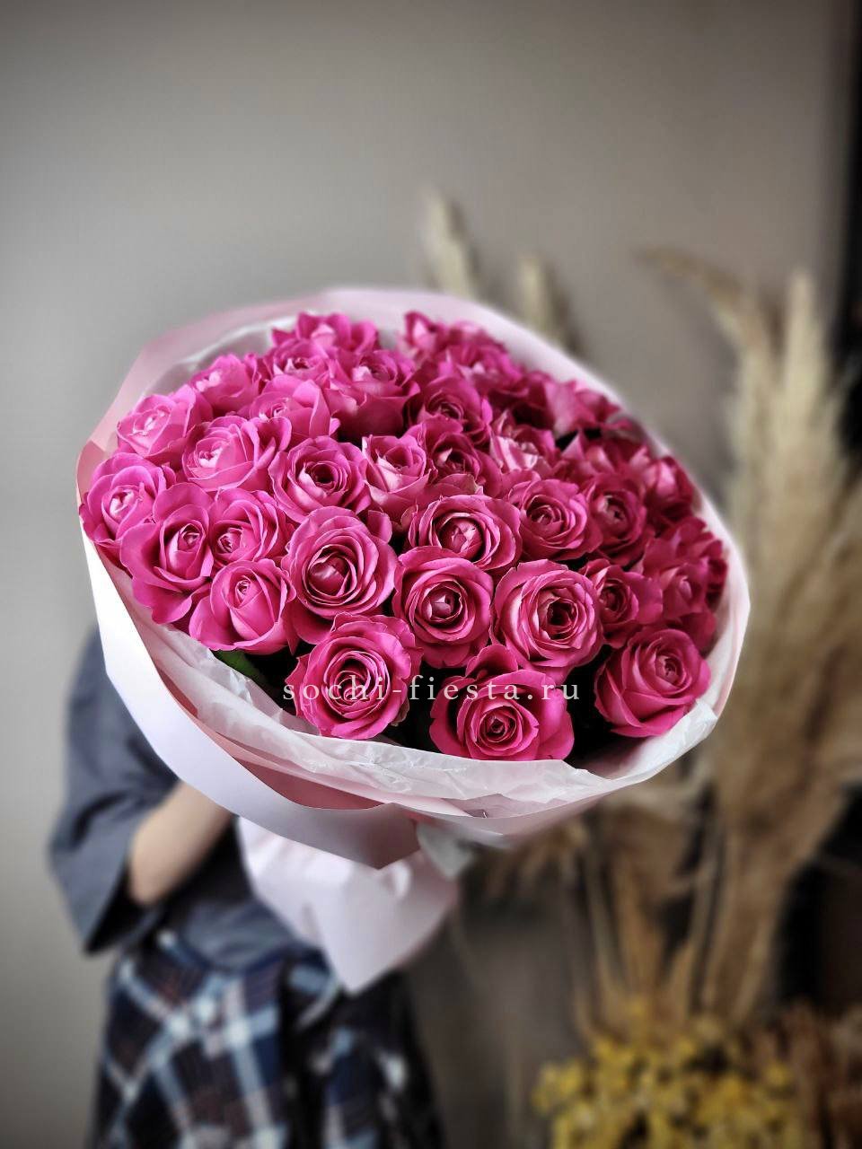 Пятьдесят одна роза собрана в плотный монохромный букет, где каждый бутон создаёт общий объём и глубину. Розовый оттенок раскрывается по-разному в зависимости от света и угла обзора. Композиция впечатляет масштабом и цельностью формы.