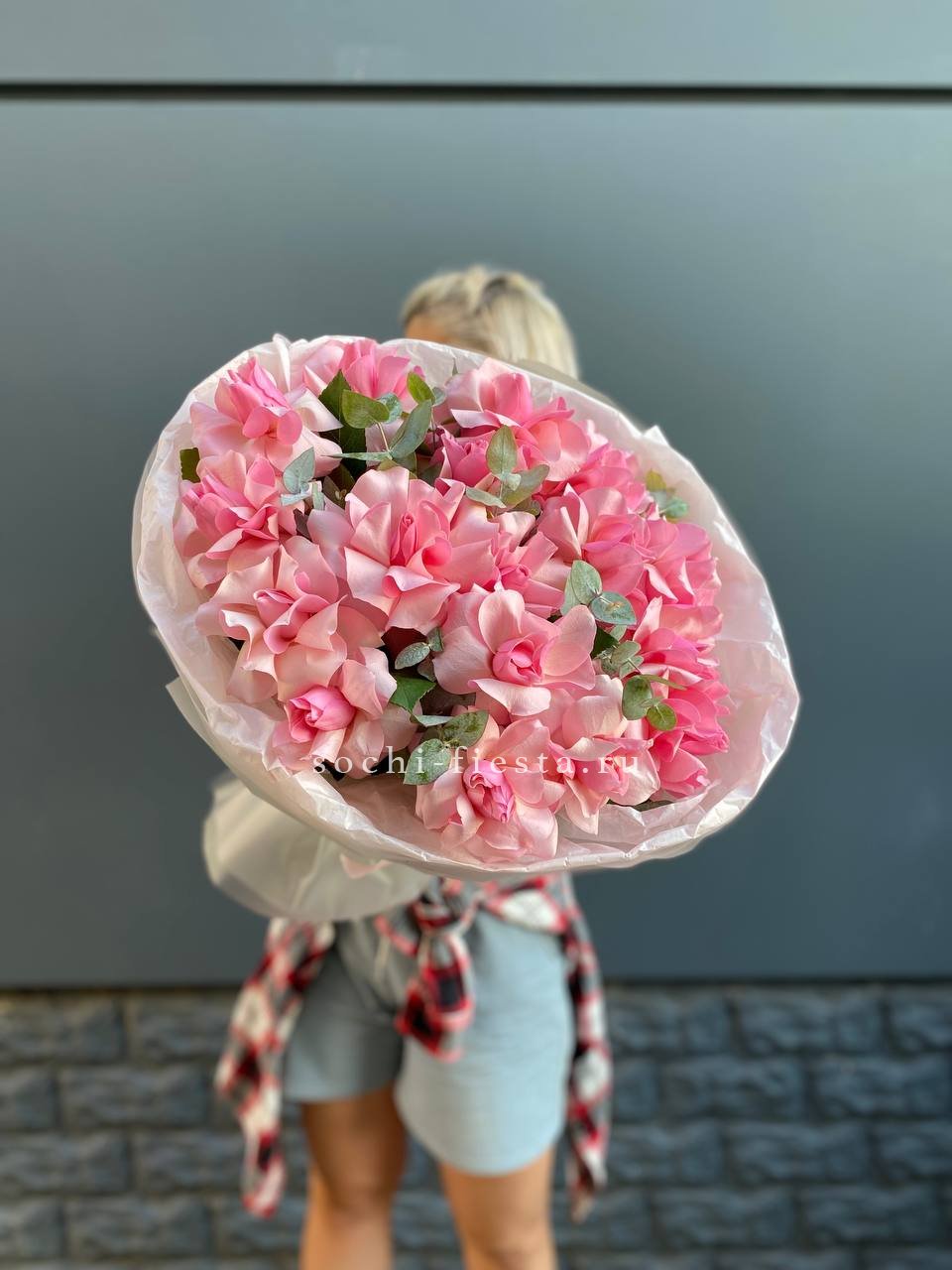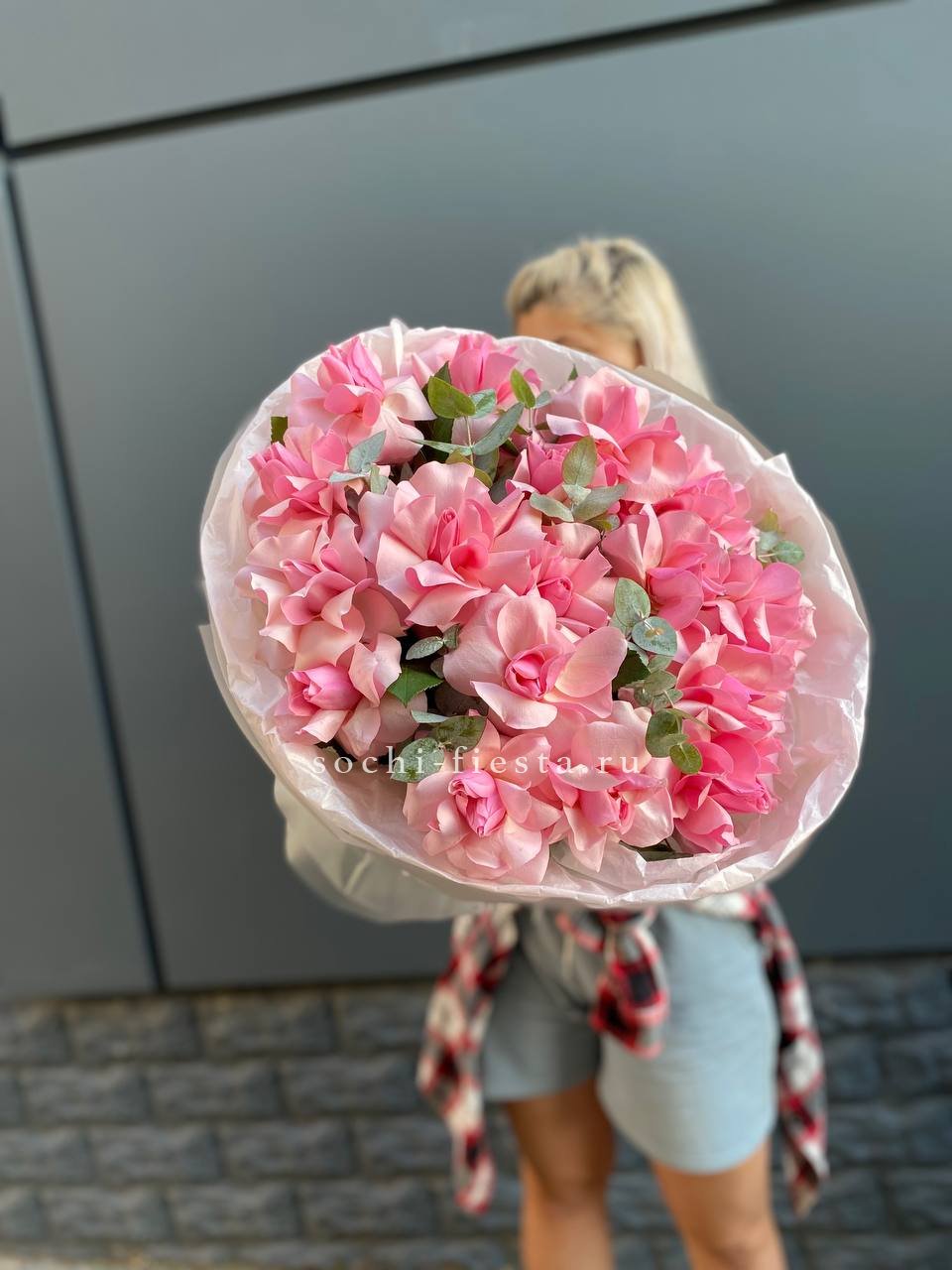 Розовые бутоны собраны в воздушную композицию с комбинированной упаковкой. Тишью добавляет фактурности, а количество цветов можно выбрать под настроение момента и масштаб события.