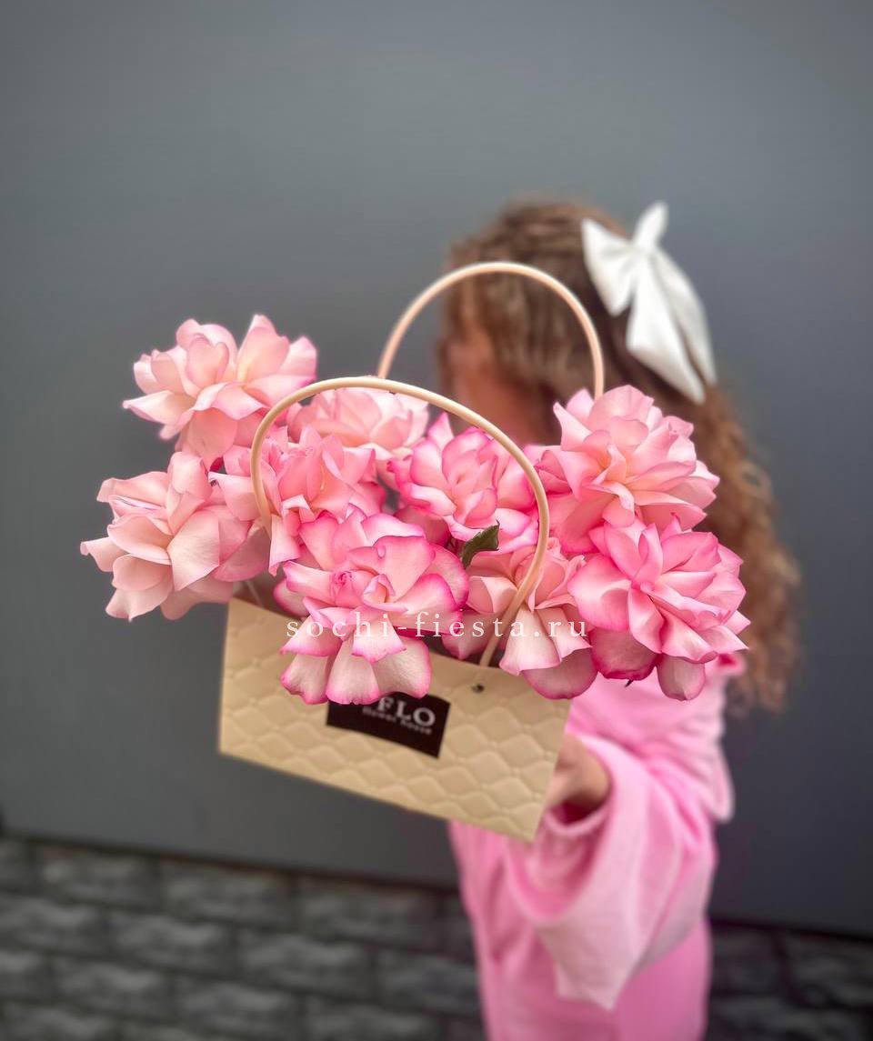 Вывернутые розы открывают всю глубину бутона и создают объёмную фактуру. Каждый лепесток развернут наружу, обнажая сердцевину. Розовый оттенок звучит свежо и современно.